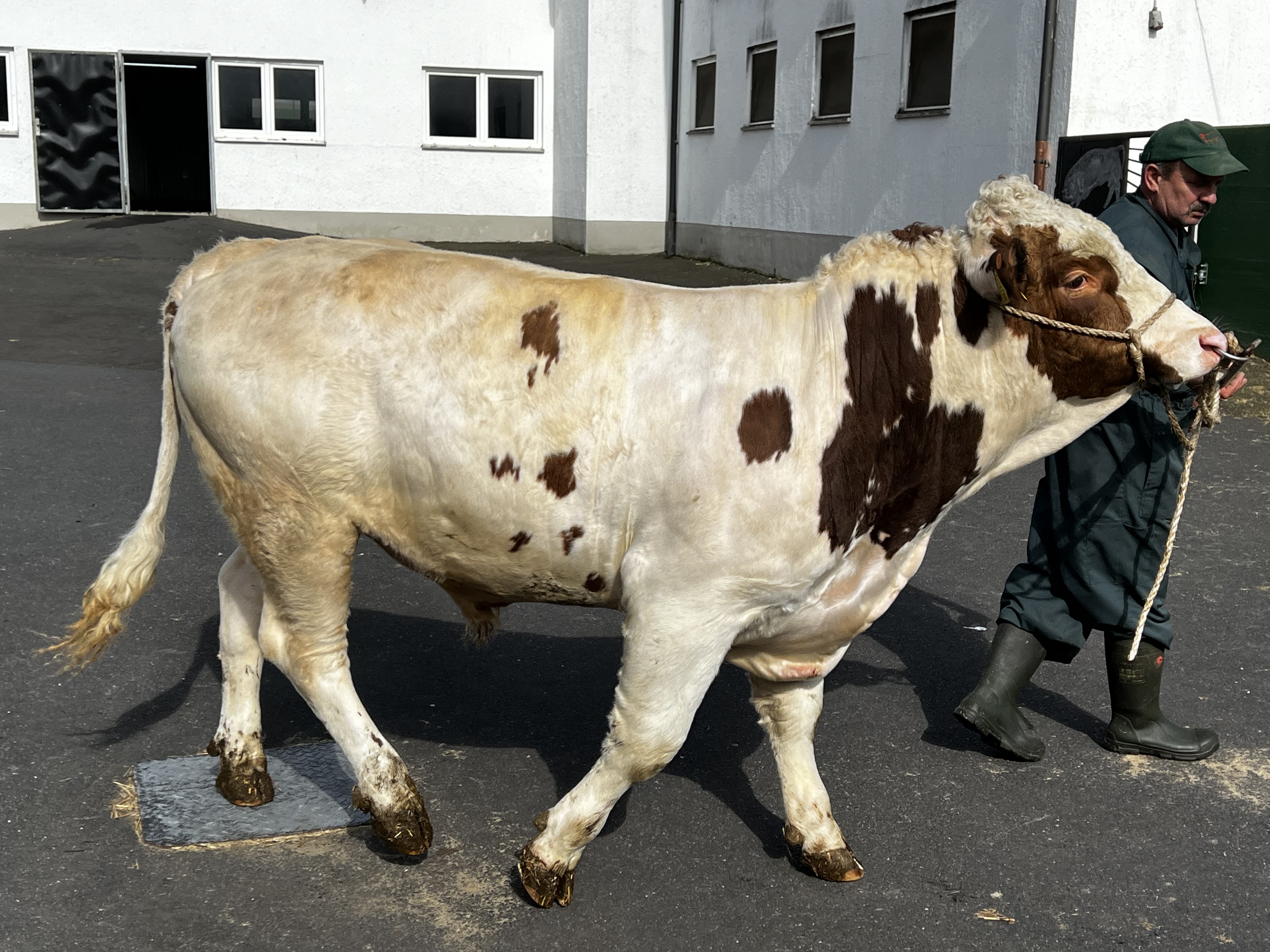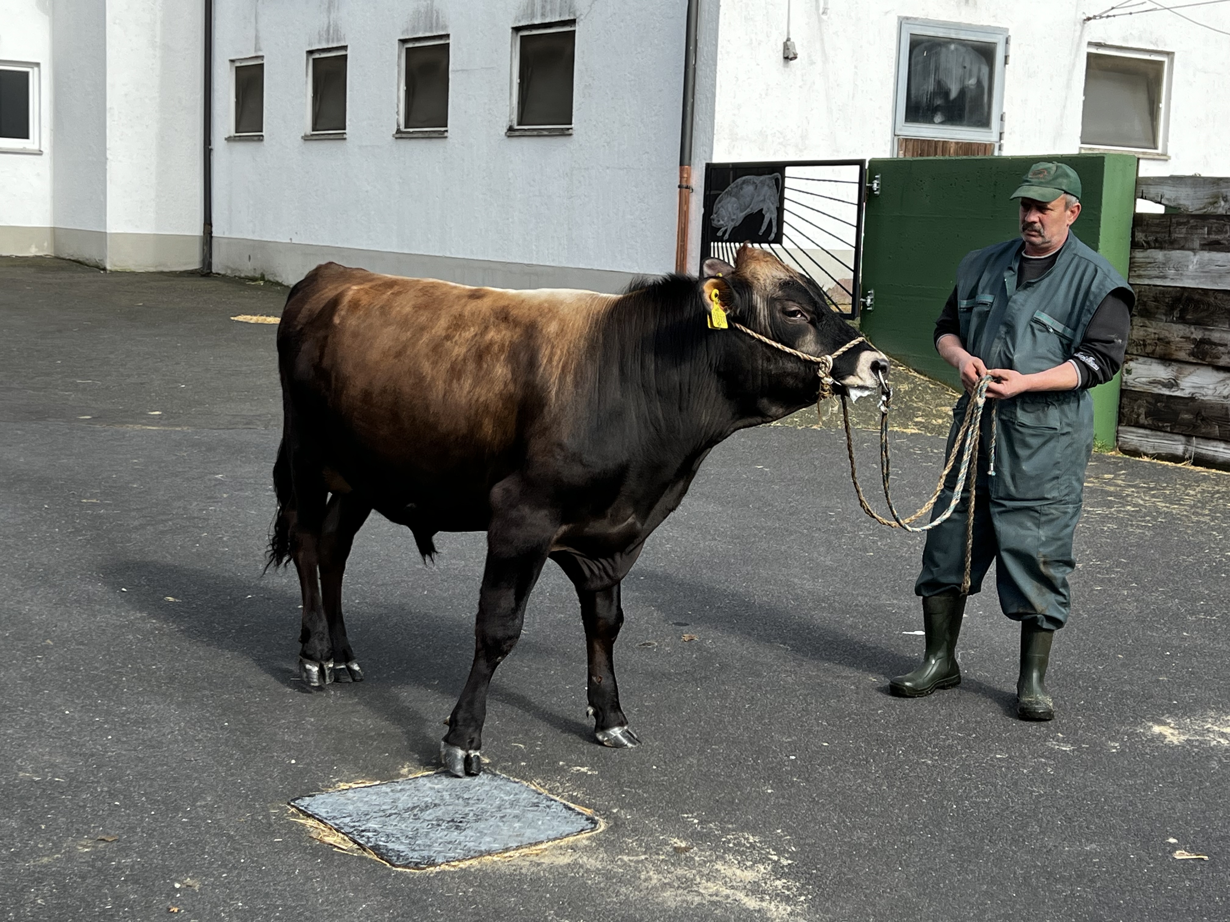 Zum Abschluss bekamen wir noch eine kleine Bullenparade. Fünf der ca. 80 Bullen der Station wurden uns vorgeführt. So unter anderem ein eher zierlicher Jersey Bulle, ein stattlicher Schwarzbunter und zum krönenden Abschluss „Snowman“, der derzeit beste Fleckviehbulle mit einem Gesamtzuchtwert (GZW) von 149. Er überzeugt mit Milchleistung, Fitness und Töchterfruchtbarkeit.