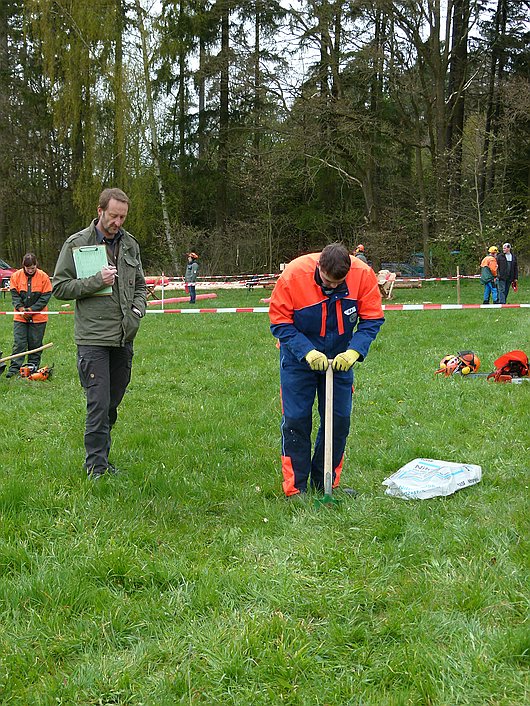 Dabei waren 10 Laubholzpflanzen im Abstand von 1,50 m in eine Reihe zu pflanzen. Hierzu standen insgesamt 10 Minuten Zeit zur Verfügung. Bewertet wurden die richtige Arbeitstechnik und die sachgemäße Arbeitsausführung. So mussten z.B. die Wurzeln der Pflanzen tief genug in der Erde verankert sein, damit ein gutes Anwachsen der Pflanzen gewährleistet ist.