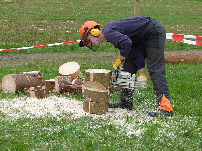 Der Übungsstamm lag auf einem mit Moos abgedeckten Brett. Der Stamm musste nach dem Durchstechen erst zum Boden hin abgesägt und dann nach oben abgetrennt werden. Beim Durchtrennen zum Boden hin sollte weder das Brett angesägt noch sollte ein Holzspan vom Stamm undurchtrennt bleiben. Durch Geschick und Übung konnte der Teilnehmer bei dieser Übung Fehlerpunkte vermeiden.