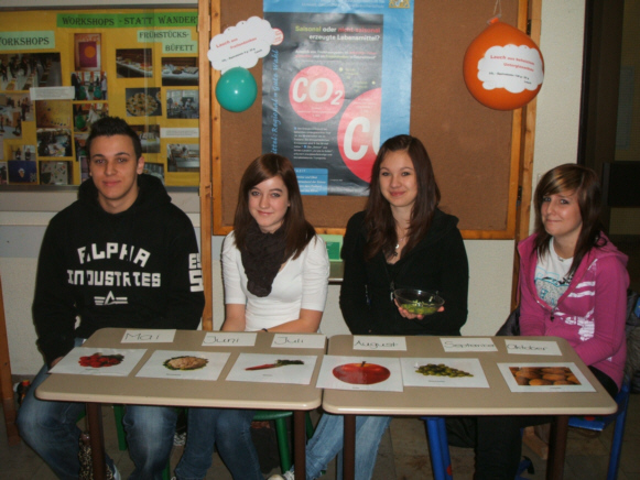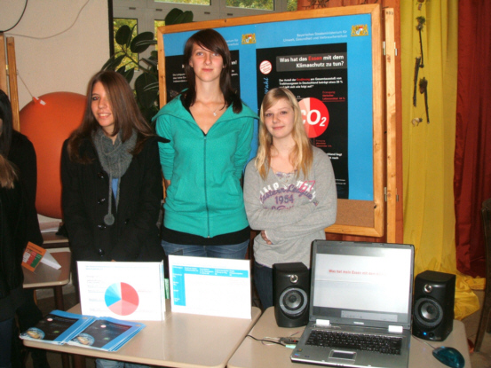 | Über diese Zusammenhänge informierte eine Ausstellung, die Schüler und Schülerinnen der Berufsfachschule für Kinderpflege im Fach Ökologie und Gesundheit aufgebaut hatten. Mit Hilfe von Plakaten des Bayerischen Staatsministeriums für Umwelt und Gesundheit zeigten sie ihren Mitschülern, wie jeder Einzelne durch seinen Konsum zur Reduzierung des Kohlendioxidausstoßes beitragen kann. |