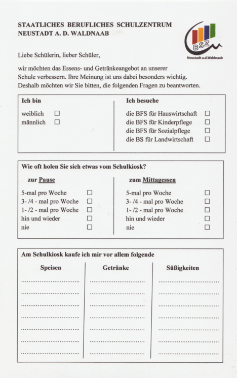 ![]() | In der Woche vor den Osterferien wurde durch Mitglieder des Arbeitskreises eine Fragebogenaktion in allen 17 Klassen durchgeführt.