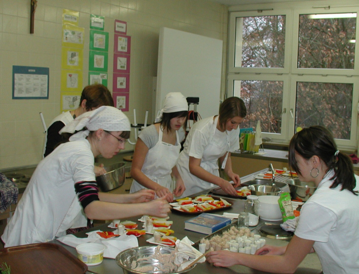 ![]() | Die Lehrkraft Frau Johanna Morka bereitet mit einer Kochgruppe der Klasse H 10 Gemüsesticks mit zwei Dips zu. |