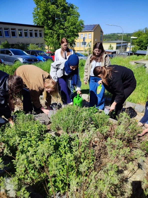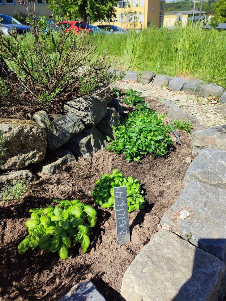 Im Frühjahr dieses Jahres war es dann so weit: Das vorhandene Beet wurde sorgfältig von Unkraut befreit und frisch bepflanzt – mit tatkräftiger Unterstützung und einer Pflanzenspende von Frau Troidl. Nun gedeihen dort verschiedene Kräuter wie Thymian, Schnittlauch oder Minze, die nicht nur für angenehmen Duft sorgen, sondern auch in der Schulküche unserer EV (Ernährung und Versorgung) Verwendung finden werden. Ein fantastisches Projekt, dass all unsere Fachbereiche und Stärken vereint.