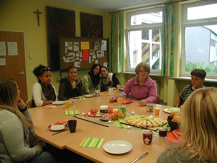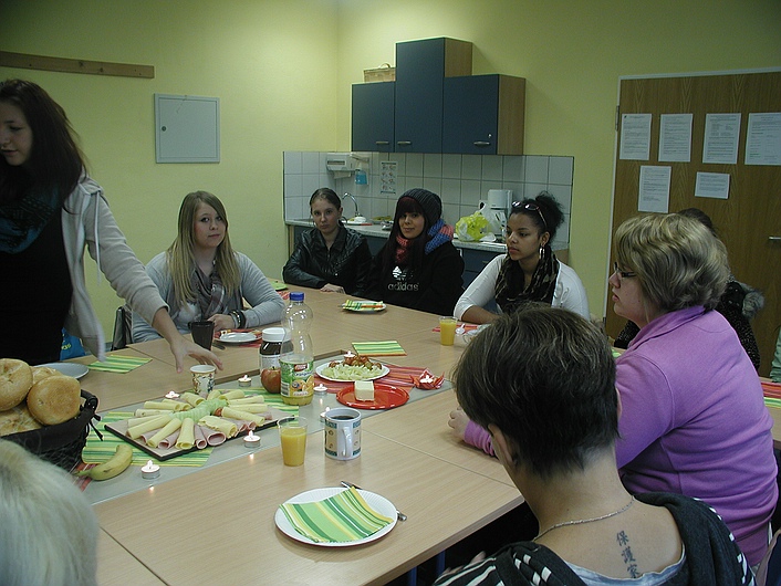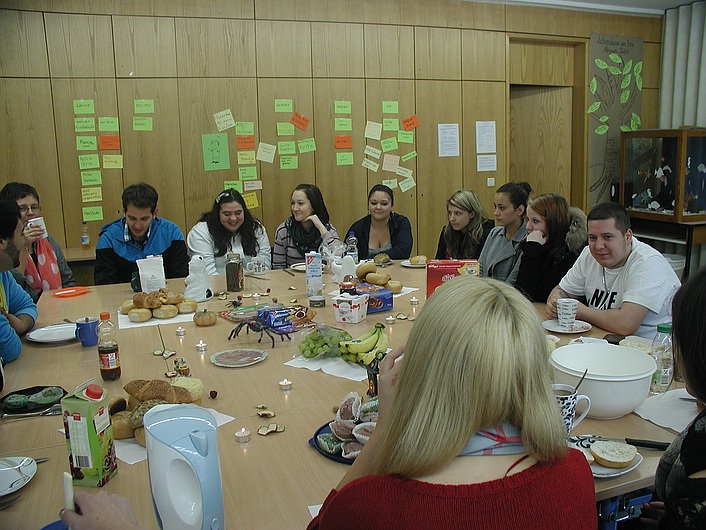 Dass beide Klassen in ihren Planungen sehr erfolgreich waren, zeigte dann das „fertige Frühstücksbuffet“, zu dem alle Mitschüler und Klassenleiter herzlich eingeladen waren. Neben den knackigen frischen Semmeln gab es Marmelade mit Butter, Käse und Wurst sowie Tomaten und Gurken aus den Gärten der Schülerinnen. Auch an frisches Obst und liebevolle, herbstliche Deko wurde gedacht. So brannten die Teelichter auf herbstfarben gefalteten Servietten oder furchterregende Herbstgeister blinzelten mit ihren hellen Augen auf den Tischen.