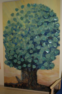 Im Anschluss an die kurzweiligen Ausführungen der Schwester wurde die Klasse in zwei Gruppen eingeteilt. Während die eine Gruppe im Wohnzimmer blieb und sich Abschiedsbücher ansah, nahmen die anderen an einer kurzen Führung durch die Station teil. Anschließend wurde gewechselt. Besonders begeistert waren die Schülerinnen und Schüler vom sehr schön eingerichteten Bad der Station, in dem Duft- und Ölbäder gemacht werden. Beeindruckend war der Raum der Stille mit einem zentral angeordneten Glasbild, Kerzen und Musik. Auch ein Patientenzimmer mit einem großen Balkon, auf den man ein Pflegebett schieben kann, stand auf dem Plan der Besichtigung.