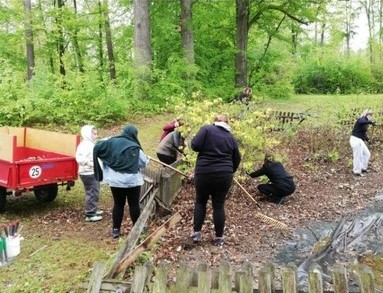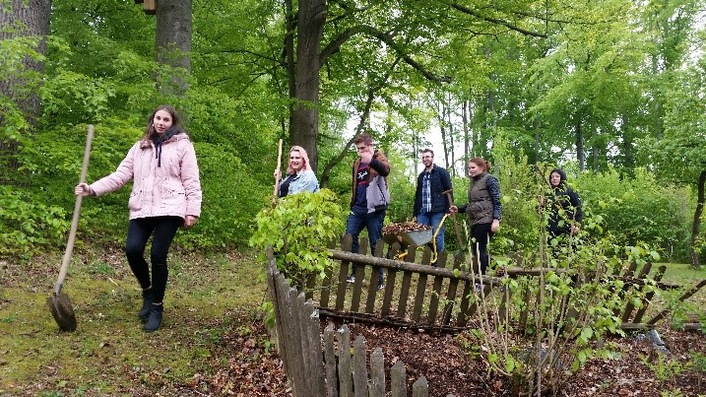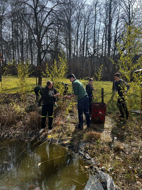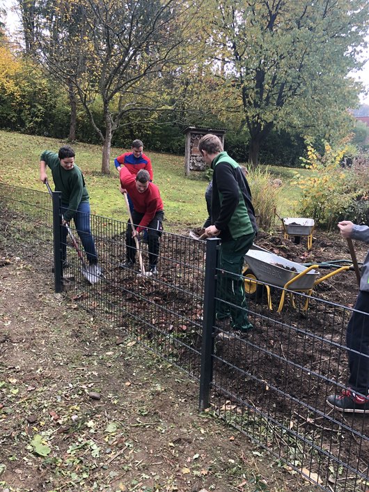 Heute waren zum ersten Mal die Helfer vom Maschinenring vor Ort und unterstützten uns bei unserer Arbeit am Teich. Sie haben das Unkraut gejätet und die wildgewachsenen Büsche ausgerissen. Am Nachmittag halfen uns die Landwirte aus dem ersten Ausbildungsjahr, indem sie die Tonscherben entsorgt und den Humus verteilt haben. Zudem haben sie einen kleinen Weg um den Teich angelegt.