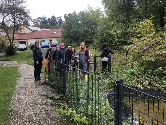 Nach dieser ersten Projektplanung wurde von der K11C gemeinsam mit Frau Stahl und Frau Bausewein der Schulteich von Laub, Unrat und Unkraut mit tatkräftiger Unterstützung der AGGS und Herrn Schätzler befreit. Das Engagement der Schüler/-innen der K11C bei der Säuberung des Teiches trotzte jeder Wetterlage, wie auf folgenden Fotos zu erkennen ist: