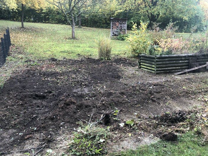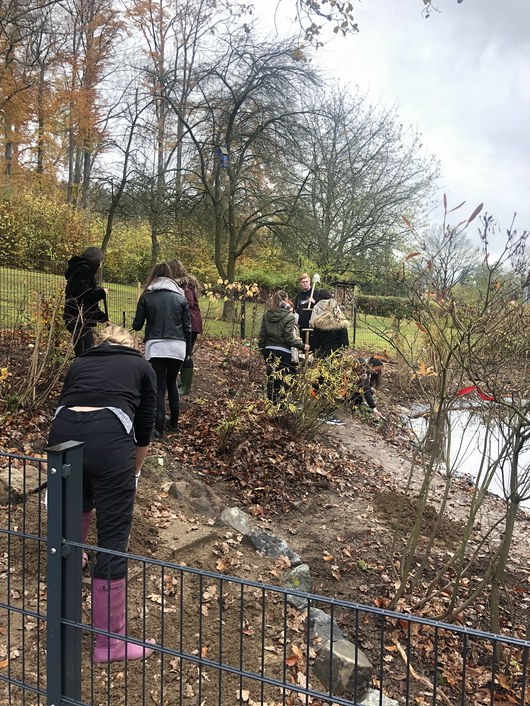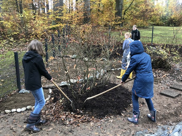 Kurz vor dem Winter mussten wir noch weiteres Unkrautfleece verlegen und Rindenmulch um die Büsche verteilen. Außerdem wurden weitere Pflanzen und Blumen eingesetzt. Einige Schüler platzierten noch weitere Steinplatten um den Teich herum. Zusätzlich wurden eine Erdbeerecke gleich neben dem Eingang sowie ein Laubhaufen angelegt. |