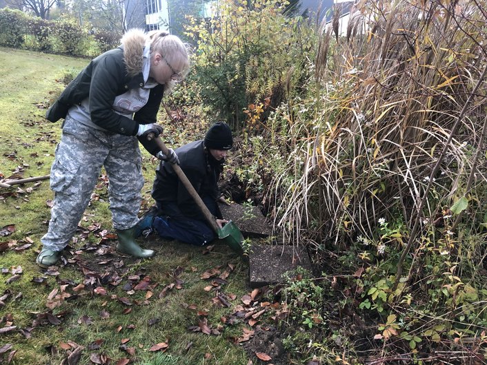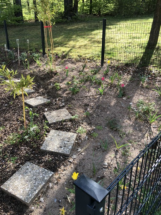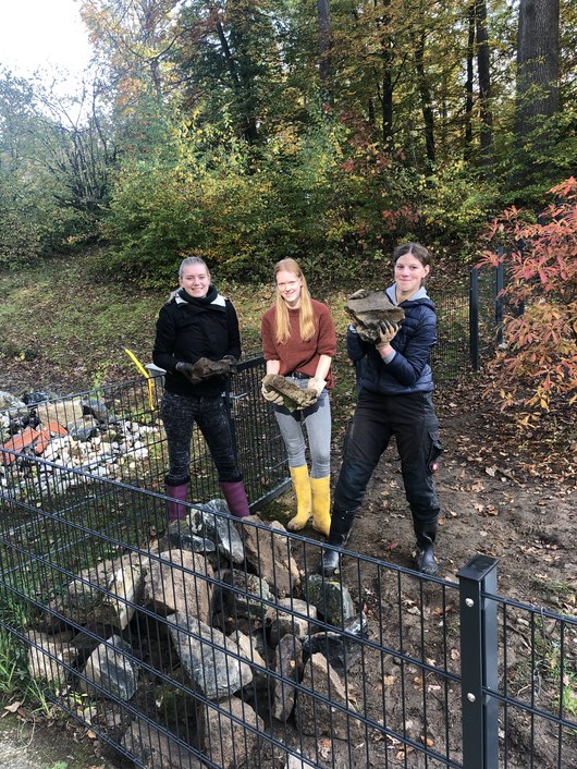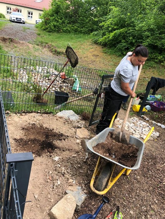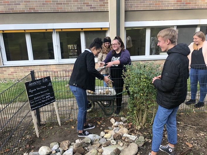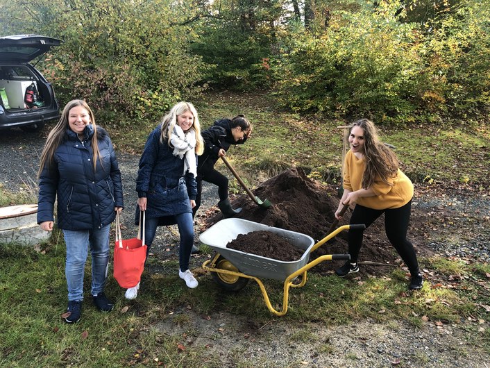 Heute war ein arbeitsreicher Tag. Zu Beginn teilten wir uns in Gruppen auf und besprachen den Tagesablauf. Dann ging es auch schon los. Eine Gruppe pflanzte die Blumenzwiebeln und Blumen rund um den Teich an. Andere legten die Kräuterecke und das Kräuterherz an. Dafür platzierten sie Steine zur Abgrenzung an den geplanten Stellen. Außerdem hat eine Gruppe die Lesesteinecke weiter aufgefüllt und das Laub zusammengerecht. Das Unkrautfleece wurde hingelegt und mit neuem Humus bedeckt. |