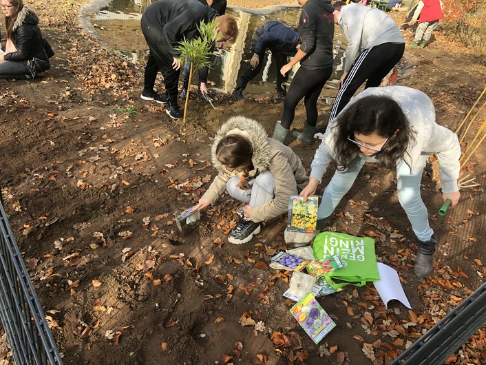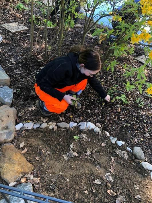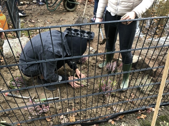 BRÜCKENTAG?! Von wegen. Wir arbeiten auch am Brückentag am Teich. Vier Schüler haben sich freiwillig dazu bereit erklärt, weitere Blumen anzupflanzen.