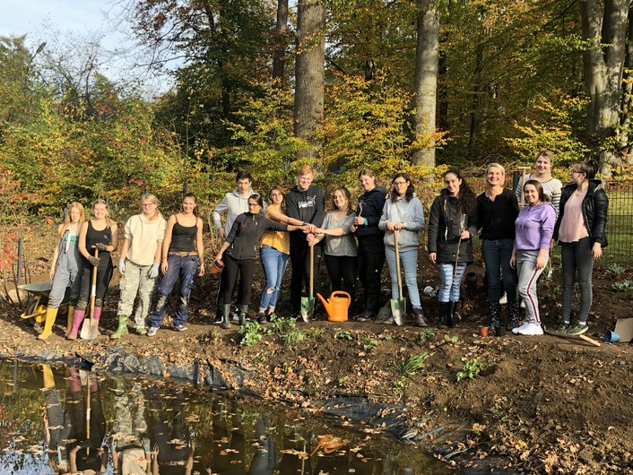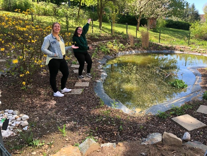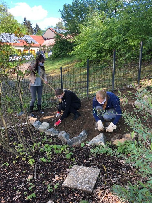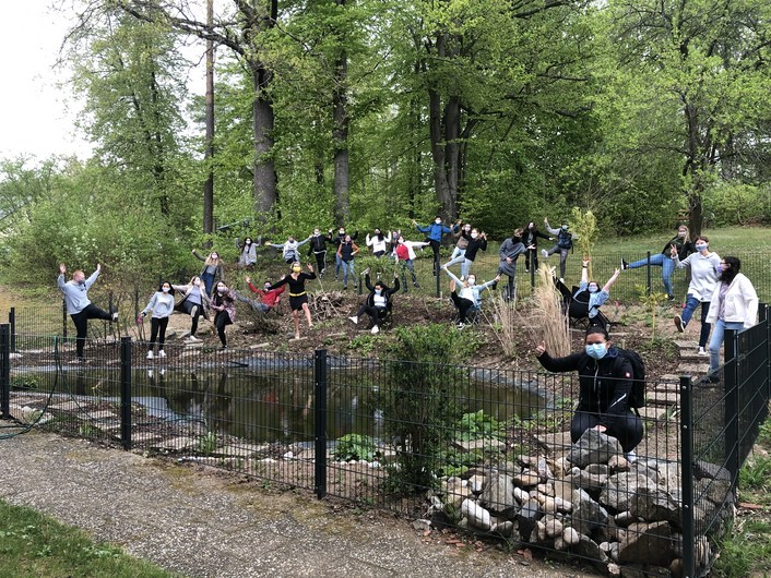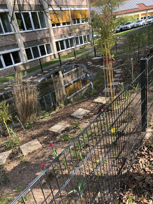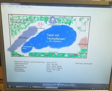 Die Schüler/-innen der K11C haben zu Beginn des Projektes recherchiert, wie die Umgebung des Teiches sowie der eigentliche Teich gestaltet sein muss, um möglichst viele Bienen und Insekten anzulocken. Die Klasse teilte sich zur Umgestaltung in kleine Teams auf, die unterschiedliche Kleinprojekte umsetzen, z. B. die Anlegung eines Blühstreifens, die Gestaltung einer Lesestein-Ecke, die Anpflanzung einer Kräuterecke und Pflanzen, die schmetterlings- und libellenfreundlich sind.