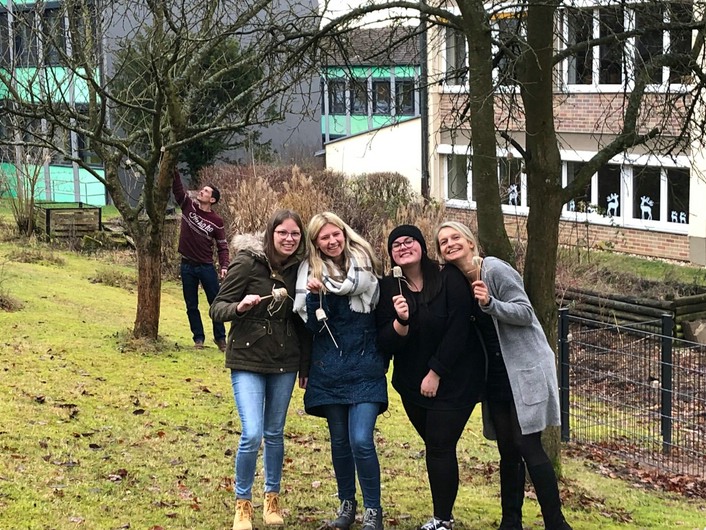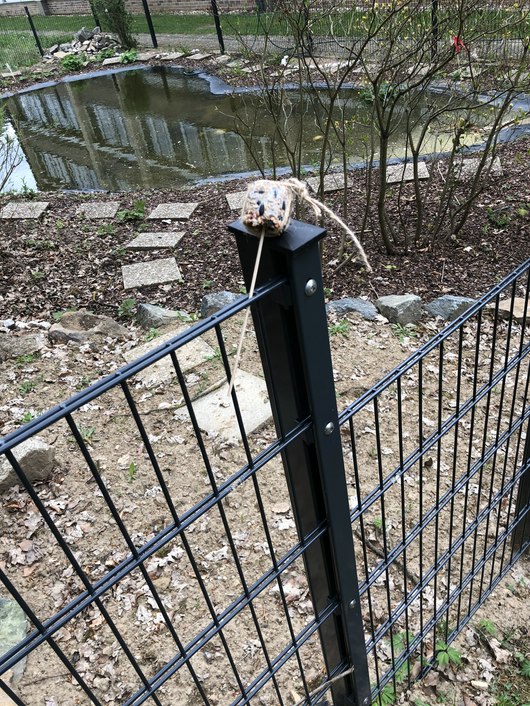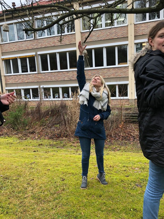 In der darauffolgenden Woche lösten wir die ausgehärteten Meisenknödel zunächst aus den Joghurtbechern und hingen sie mithilfe einer komplizierten Bindetechnik an die Bäume, die das Teichgebiet umgeben. Mit dieser Vielzahl an Futterstellen im Teichgebiet und dessen Umkreis unterstützen wir Vögel bei ihrer Futtersuche im Winter. |