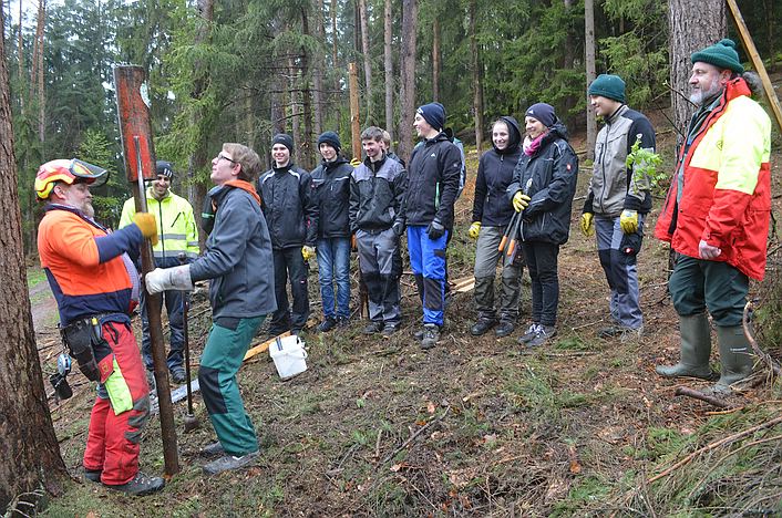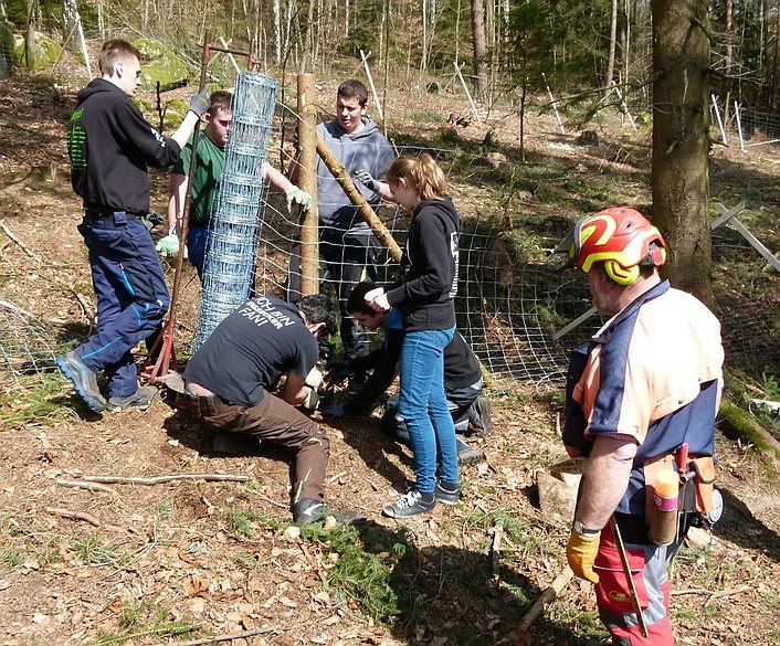 Die Schüler des Berufsgrundschuljahres des Berufsschulzentrums Neustadt unter Leitung von Studiendirektor Reiner Butz übten den praktischen Zaunbau im Gemeindewald Leuchtenberg.