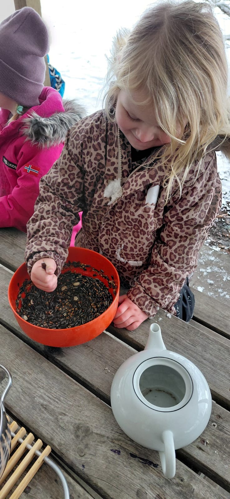Im Monat Januar stand erneut der Schnee ganz im Vordergrund. Es hat immer wieder etwas geschneit und durch die kalten Temperaturen blieb der Schnee auch liegen. Das ist in Dänemark sehr besonders. Die Zeit wurde deswegen genutzt, um im Garten Schneemänner zu bauen und natürlich Schlitten zu fahren. Mit den Kindern habe ich ein pädagogisches Bildungsangebot durchgeführt, bei dem wir Vogelfutter für die Vögel herstellten.