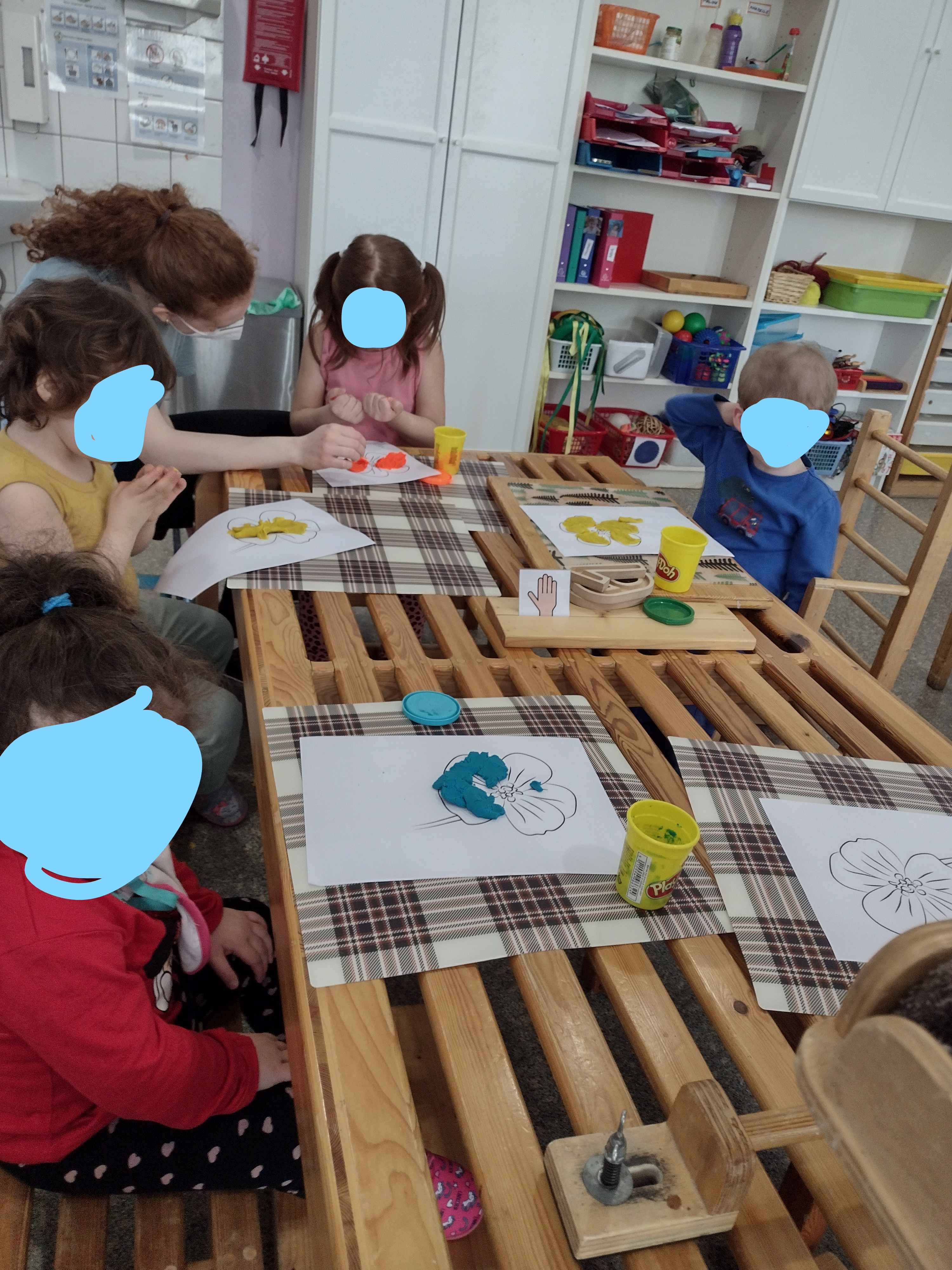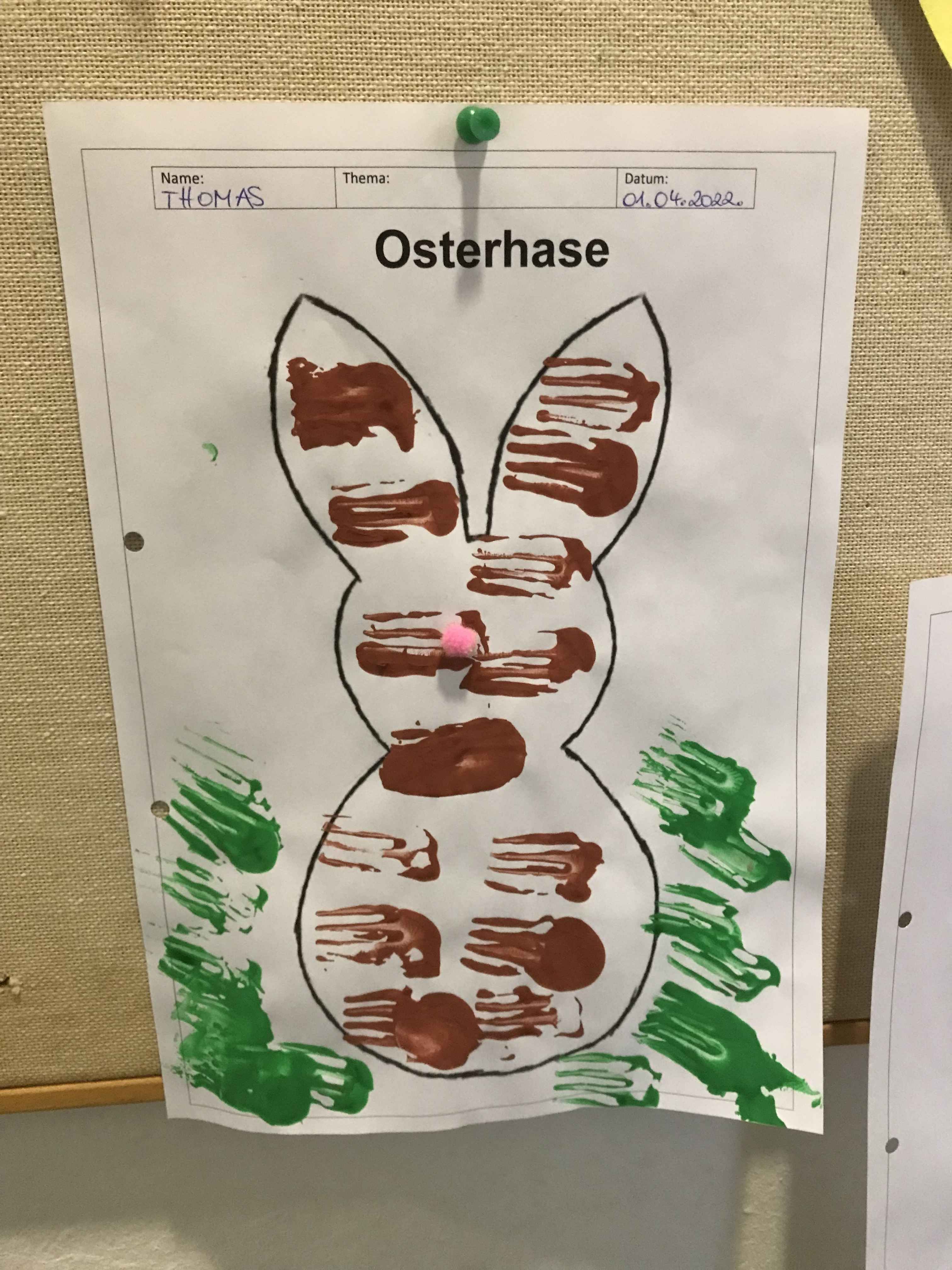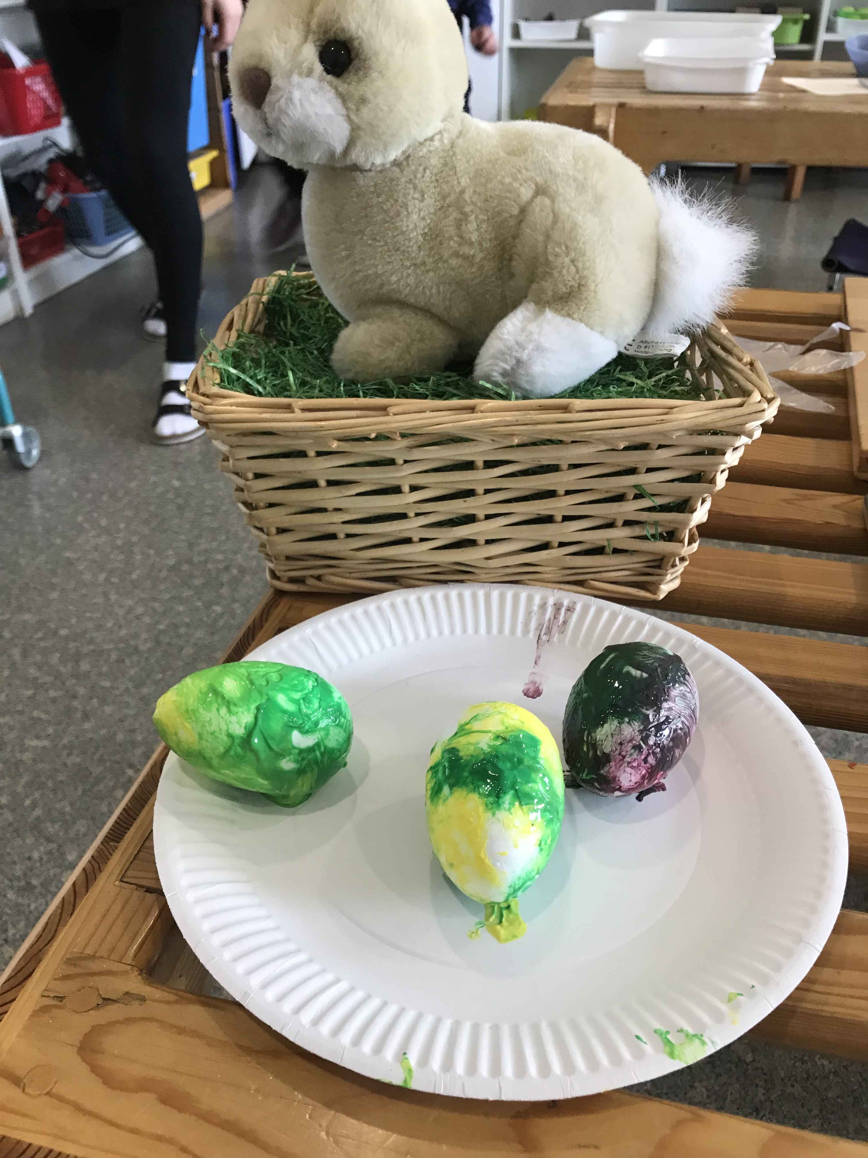 Das Osterfest rückte im April immer näher, deswegen schmückten wir den Gruppenraum, um alle auf die Osterzeit einzustimmen. Die Kinder lernten im Morgenkreis Oskar, den Hasen kennen. Er begleitete uns bis Ostern und brachte die österlichen Werte und Bräuche näher. Die Kinder lernten Ostern durch Bilder und Osterlieder kennen. Wir sangen und musizierten mit dem Hasen. Die Kinder wurden dadurch in der Feinmotorik gefördert und ihre Rhythmusfähigkeit wurde angeregt. Die einzelnen Förderprogramme griffen die Ostersymbole Hase oder Ei immer wieder auf, so wurde das Thema weiter vertieft.