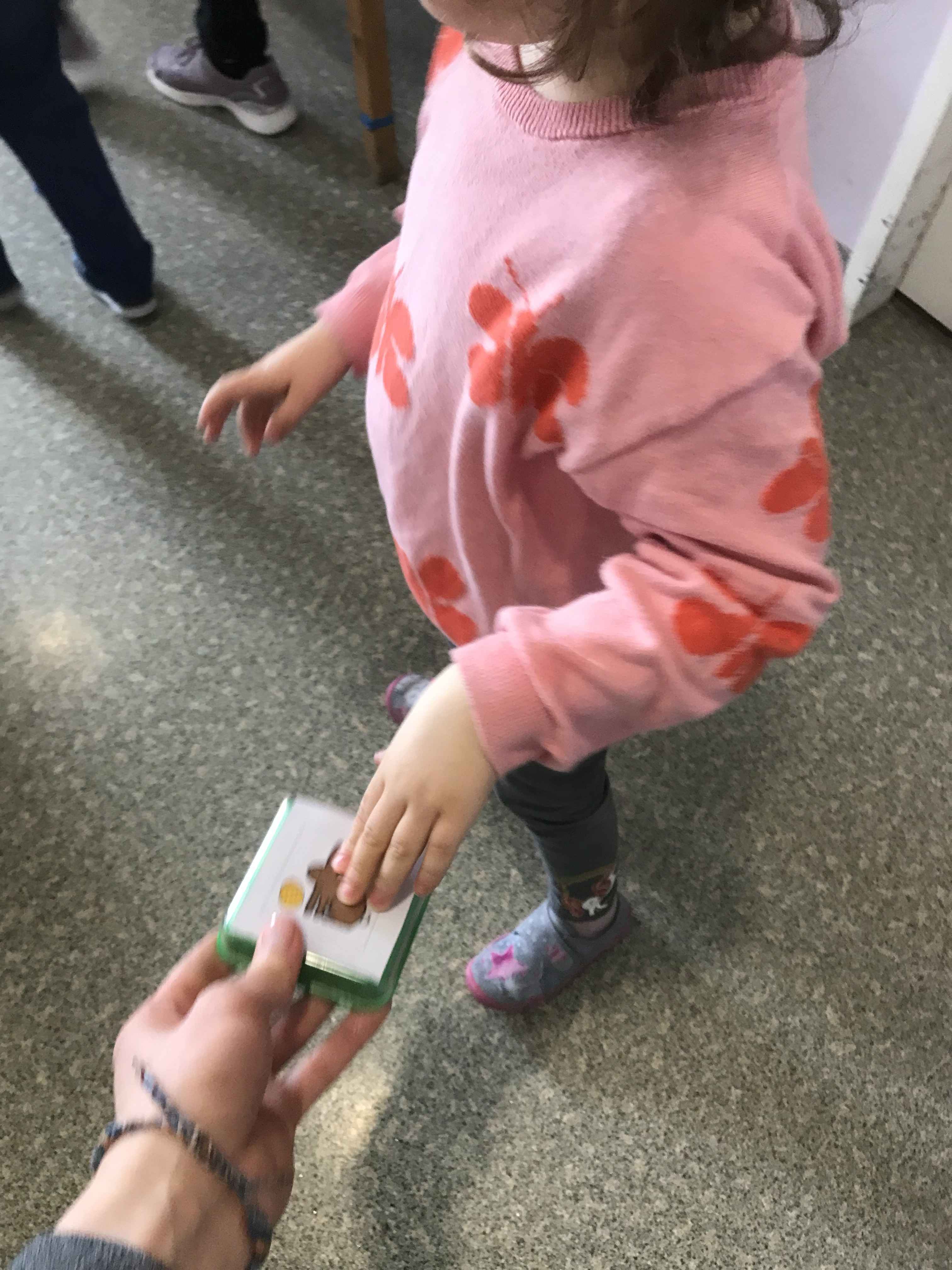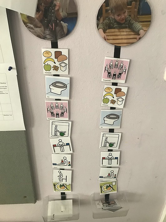 Im Januar kam eine Fachkraft aus der Elternzeit zurück. Sie bereichert durch ihre Erfahrung im Bereich der Heilpädagogik unser Team. In der Vergangenheit arbeitete sie überwiegend mit Autisten. Sie verfügt über eine Ausbildung im Kommunikationsmodell „PECS“. „PECS“ heißt „Picture Exchange Communication System“ und ist eine aus der USA stammende bildgestützte Kommunikationshilfe und wurde für autistische Kinder entwickelt. Die Kinder können mit Hilfe von Bildkarten Tagesabläufe bestimmen, zwischen zwei Dingen entscheiden oder ganzen Sätze bilden. Das Erlernen von PECS bietet unseren Kindern neue Möglichkeiten der Kommunikation. Ich bin in einer Gruppe mit mehrfachbehinderten Kindern, einige von ihnen zeigen aber auch autistische Züge und sind kognitiv soweit entwickelt, dass sie die PECS Kommunikation erlernen können. Wir arbeiten am Anfang viel mit Konditionierung, da die Kinder erst die Karten und deren Bedeutung begreifen müssen. Die Lernfortschritte sind auch nur sehr klein. Einzelne Schritte müssen häufig wiederholt werden.