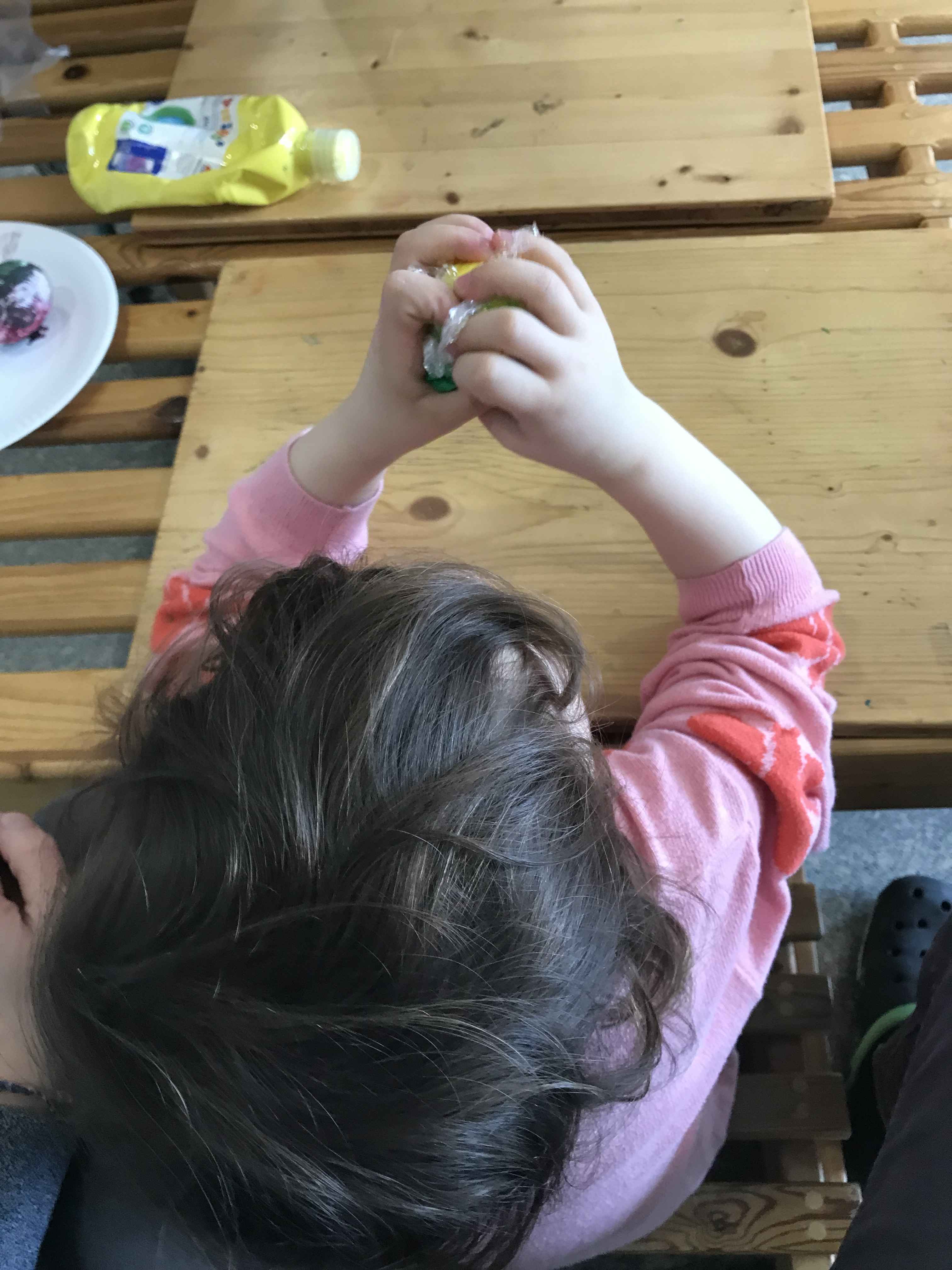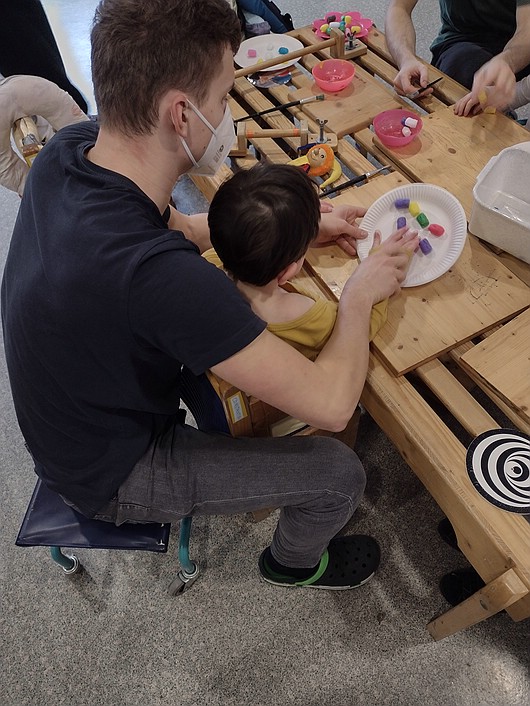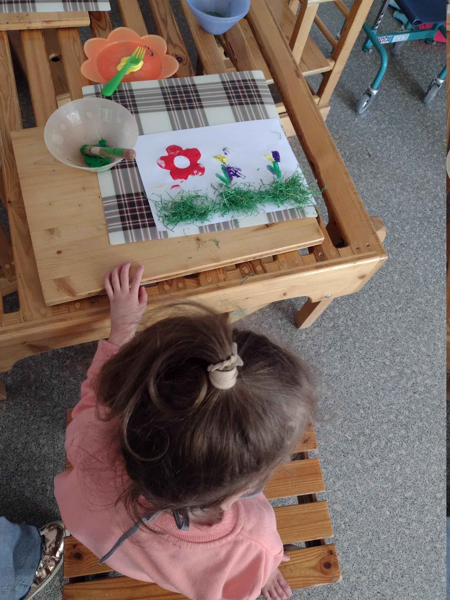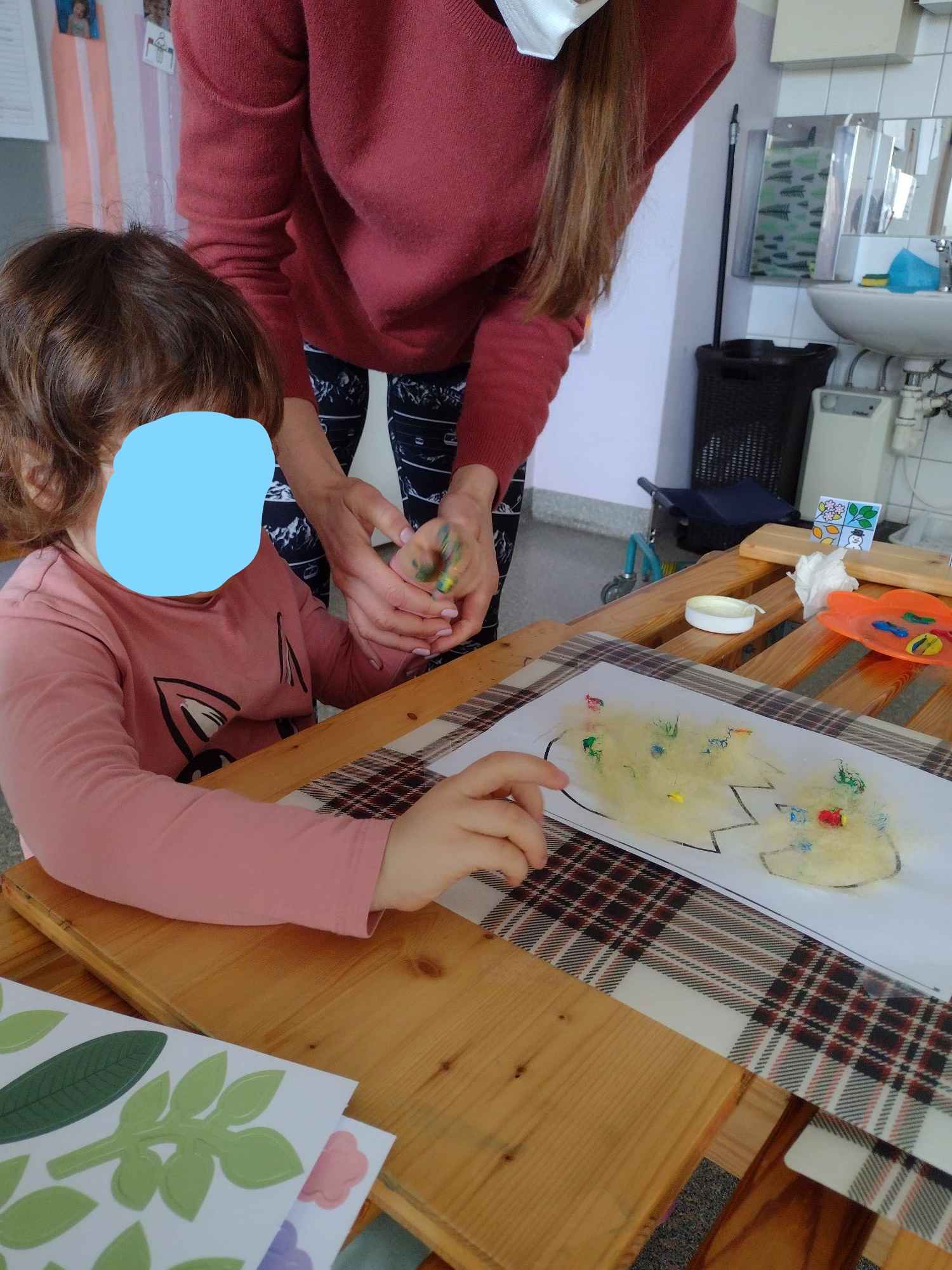 Die Kinder gestalteten ein Osterei mit Watte und färbten es. Sie bemalten einen Hasen mit Hilfe der Gabeldruck-Technik und schulten so die Griffhaltung. Zum Abschluss halfen die Kinder dem Osterhasen und bastelten eine Osterkarte und ein Osterei für ihre Eltern als kleines Ostergeschenk. Hierzu mussten die Kinder Styroporeier eingewickelt in Frischhaltefolie mit Fingermalfarbe bearbeiten. Hierdurch wurde die sensomotorische Wahrnehmung angesprochen. Die Kinder lernten, die Reize der unebenen und weichen Oberfläche zu verarbeiten und vollzogen auf diese Weise eine sensorische Integration zwischen den Fühlrezeptoren und dem Gehirn.