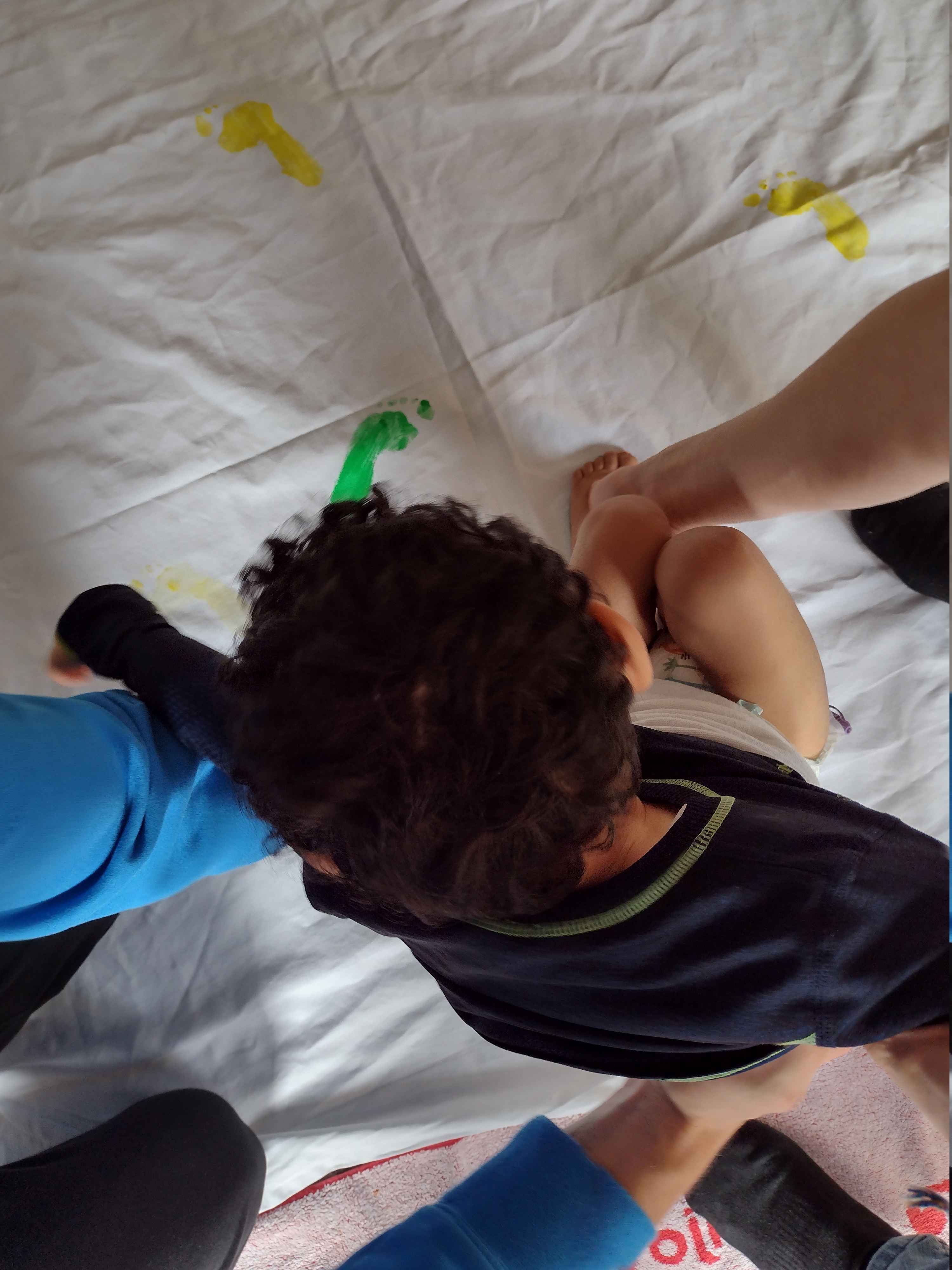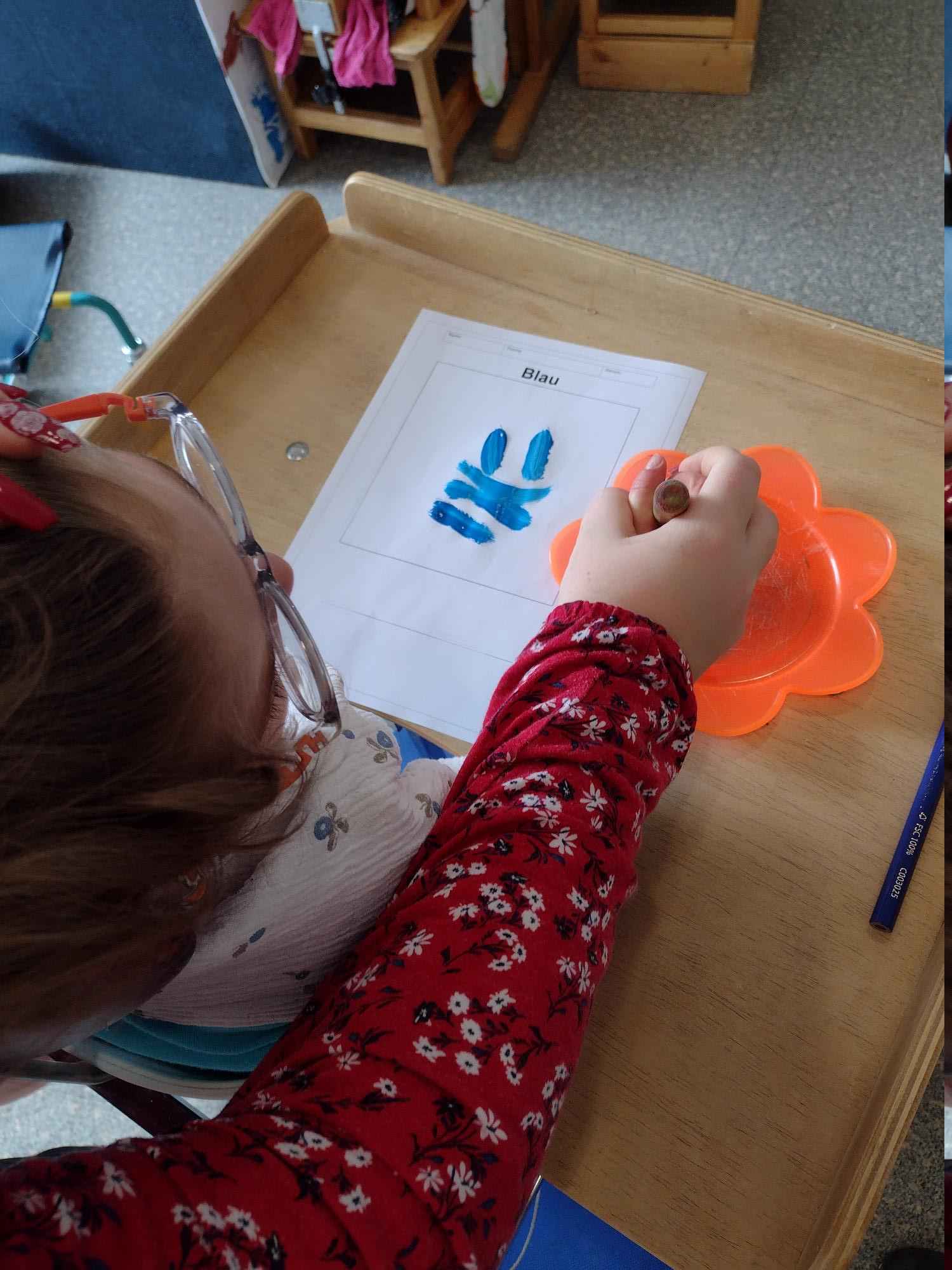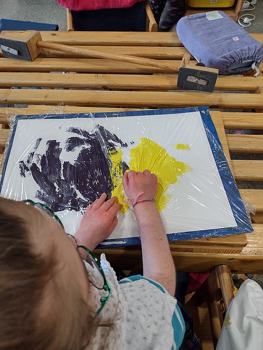Zu den Blumen gehören auch deren bunte und unterschiedliche Farben. Hierzu lernten wir die verschiedenen Farben auf unterschiedliche Weise kennen. Ich plante ein Farbenklangspiel und die Kinder spielten zu jeder einzelnen Farbe ein eigenes passendes Instrument. Wir lernten das Lied „Grün, grün, grün sind alle meine Kleider“. Für jede Strophe wurde ein anderes Instrument gespielt. An jedem Tag beschäftigten wir uns mit einer weiteren Strophe, deren jeweilige Farbe das Thema des Tages darstellte. So wurde am ersten Tag die Farbe Grün besprochen, am zweiten Tag die Farbe Gelb und so weiter. Die Kinder gestalteten mit Hilfe verschiedener Techniken an jedem Tag ein passendes Arbeitsblatt mit den entsprechenden Farben. Die Therapiematerialien wurden für diesen Tag auch passend zu der Farbe gewählt und wir bauten täglich einen Barfußpfad in der passenden Farbe auf. In der Snoezelen-Ecke wurden das Licht und die Einheiten ebenfalls passend zur Themenfarbe des Tages gewählt.