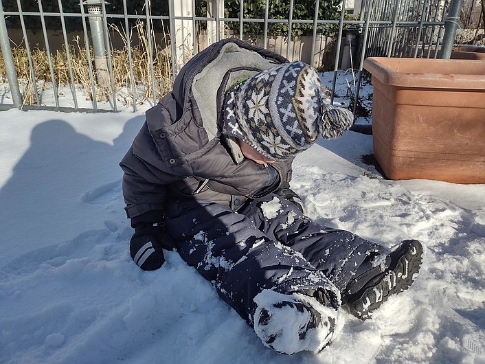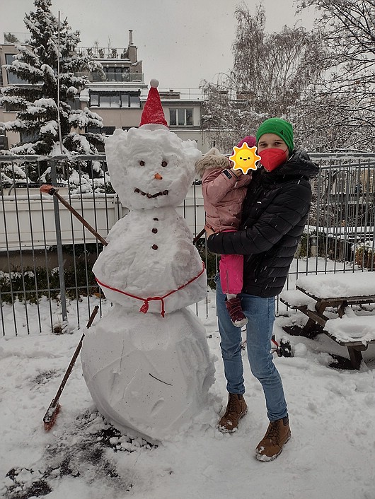 Im Dezember bereiteten sich alle Gruppen auf das Weihnachtsfest vor. So schmückten wir gemeinsam mit den Kindern den Gruppenraum winterlich und gestalteten einen Adventskranz. Das Leitthema im Dezember war in unserer Gruppe „Schnee“. Wir bastelten Schneeflocken und lernten die Eigenschaften von Schnee kennen. Die Kinder konnten draußen den Schnee mit allen Sinnen erleben und hatten große Freude am Fühlen von Kälte. Wir sangen passende Schneelieder und hörten eine Klanggeschichte über den Schnee. Idealerweise hat es in der ersten Dezemberwoche zu unserer Freude viel geschneit. Wir nutzten die Gelegenheit und spielten auf der Dachterrasse. Gemeinsam mit den Kindern der Integrationsgruppen bauten wir einen großen Schneemann. Aus der Küche holten wir eine Karotte für die Nase und nahmen Kastanien für die Augen, den Mund und die Knöpfe. Unser Schneemann bekam auch einen Gürtel, als Hut setzten wir ihm eine Nikolausmütze auf. Für die Arme steckten wir einen Rechen und einen Besen in den Schneemann. Wir nutzen die restliche Woche, um auf der Dachterrasse mit dem Schnee zu spielen. Leider schmolz er in der nächsten Woche schon wieder.