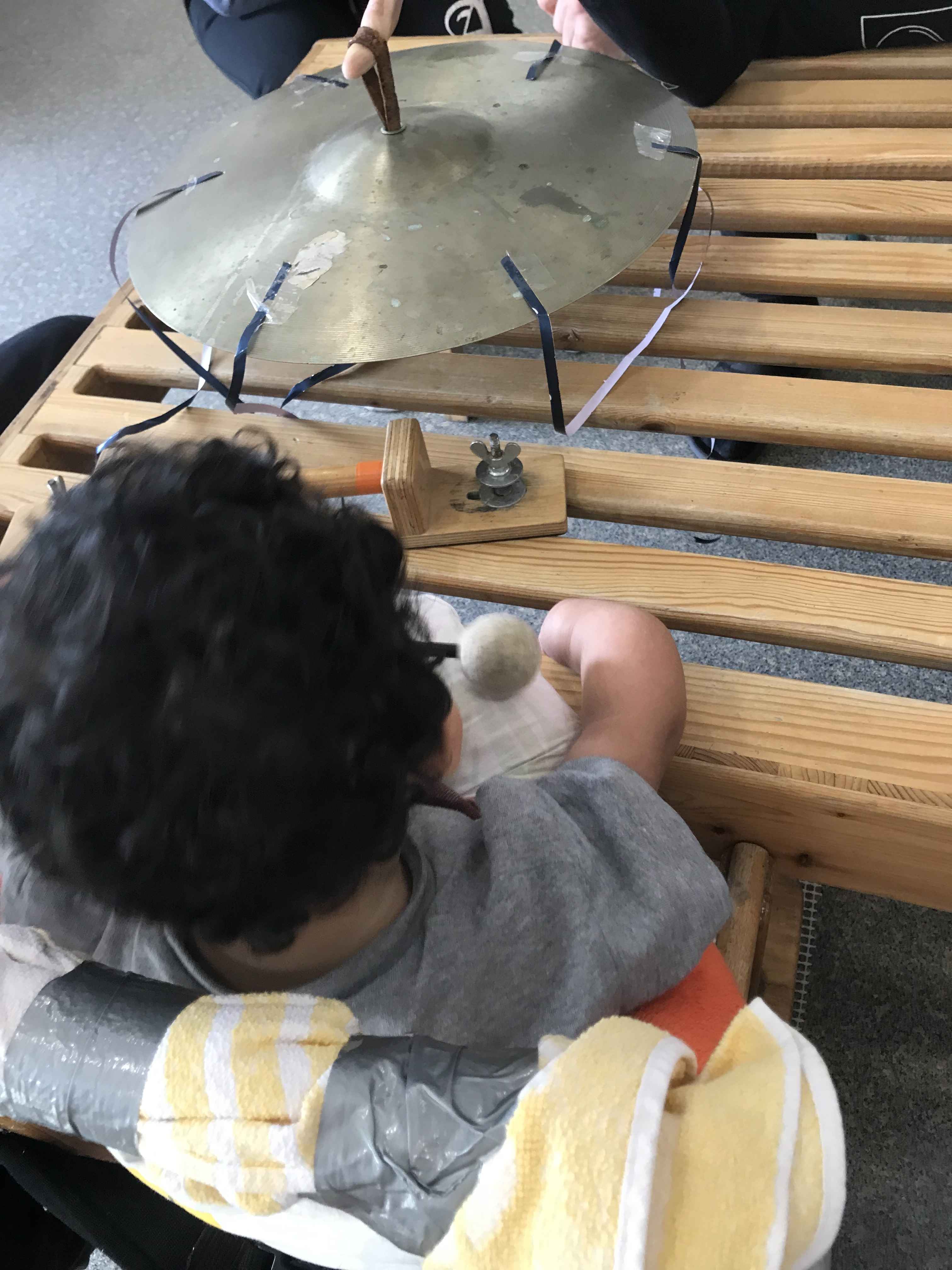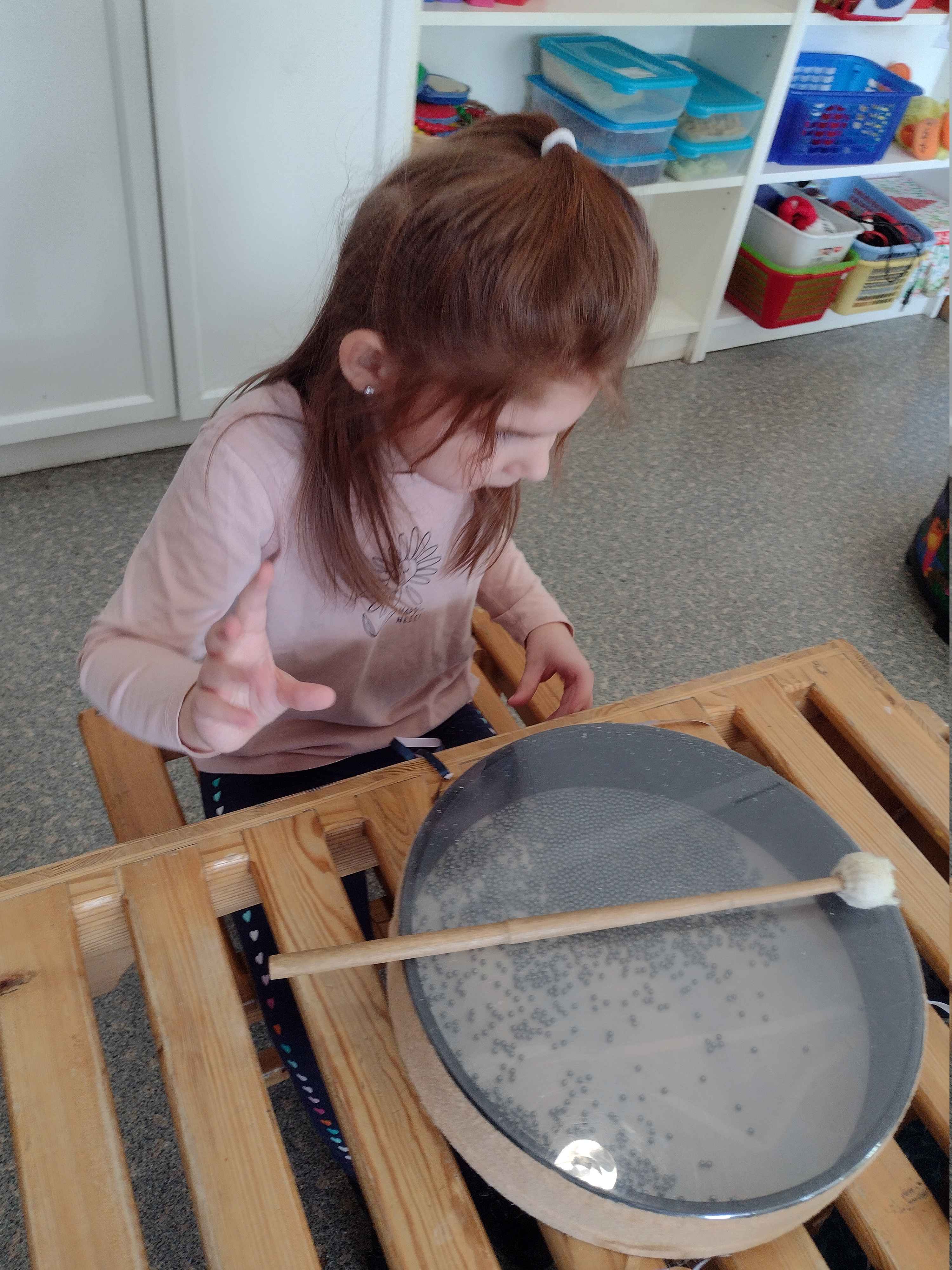 Die ersten zwei Wochen drehte sich in meiner Gruppe noch alles um das Thema Frühling und seine Farben. Hierzu vertieften wir das Erlernte und wiederholten die Farben und Lieder auf der Dachterrasse. Die Kinder der Integrationsgruppen gesellten sich zu uns und wollten mit musizieren. Gemeinsam spielten wir die Orff-Instrumente und sangen die Lieder. Die Kinder halfen den eingeschränkten Kindern beim Spielen der Instrumente, indem sie beim Halten der Instrumente und beim richtigen Einsatz Unterstützung gaben. Es war schön zu beobachten, wie die Kinder miteinander umgingen und sich so gegenseitig bereicherten. So ist ein schönes und gemeinschaftliches Musikprogramm entstanden. Der visuelle Bereich wurde zusammen mit dem Taktilen verknüpft, indem in verschiedenen Wahrnehmungsprogrammen verschiedenfarbige Lichter in Fühlboxen versteckt wurden. Mit Hilfe einer großen Lichttaste, die an normale Lampen angeschlossen werden kann, konnten die Kinder verschiedene Farben des Lichtes selbstständig einschalten und eigenständig entscheiden, welche Farbe des Lichtes sie auswählen wollten.