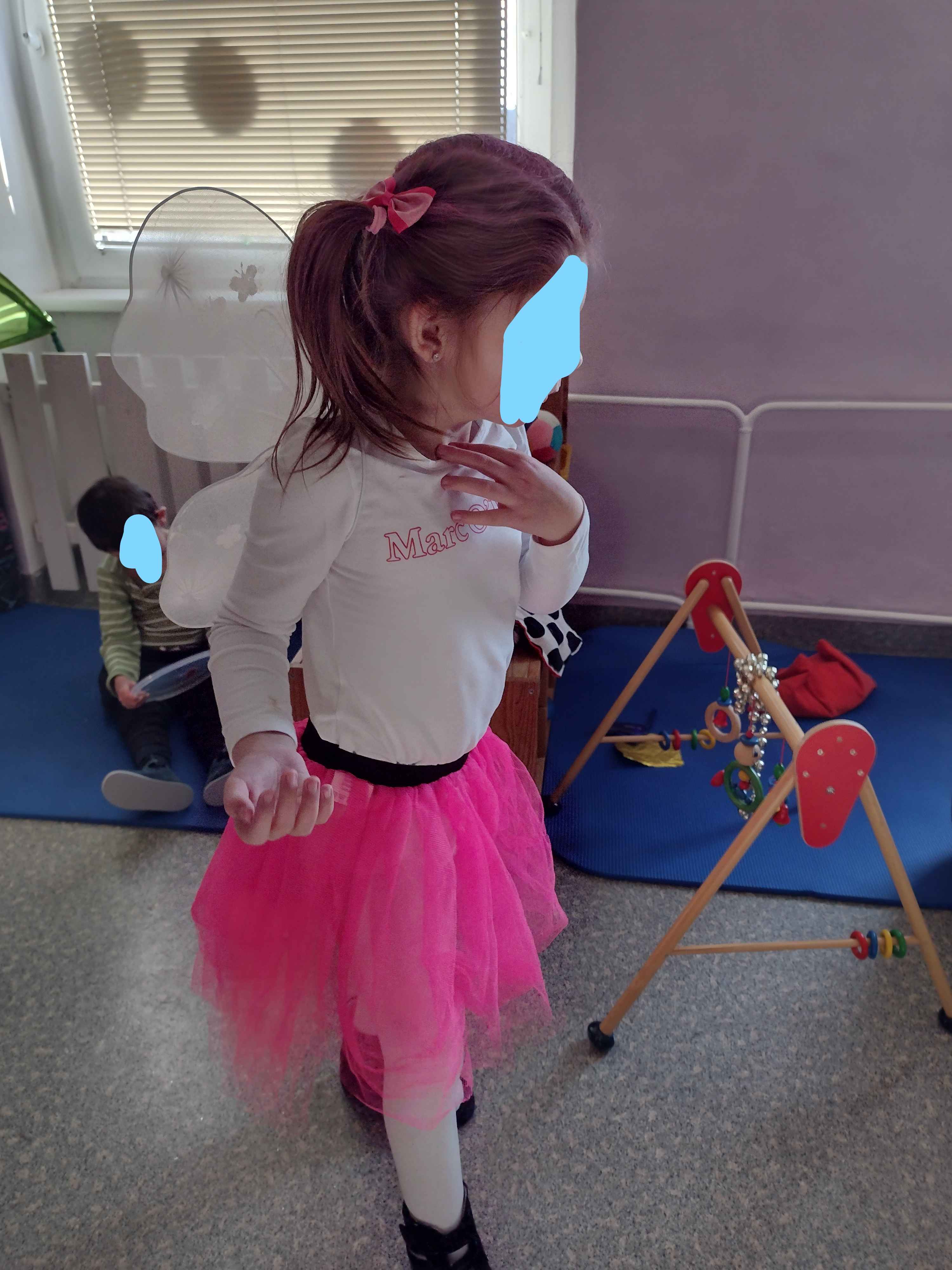 Das Beste am Fasching ist, in andere Rollen zu schlüpfen und sich zu verkleiden. Dies machten wir in der dritten Februarwoche. Wir ließen die Kinder sich selbst kennen lernen. Verschiedene kleine äußerliche Veränderungen vermittelten ihnen was zu ihnen gehört. Zum Gesicht lernten die Kinder einen kleinen Reim und zählten alle Teile des Gesichts auf. Vor ihnen wurde ein kleiner Spiegel aufgestellt. Die Kinder konnten sich darin betrachten und sehen wie sie aussahen. Im Anschluss veränderten wir ihre Gesichter indem wir zum Beispiel die Nase mit Farbe anmalten, die Haare mit einem Tuch verdeckten, ein Auge mit einer Augenklappe verdeckten. Ähnlich veränderten wir auch den Körper. Auch in der Physiotherapie wurde das Thema aufgegriffen. Die Kinder bekamen Massagen und wurden mit Vibratoren an verschiedenen Stellen des Körpers stimuliert. So spürten die Kinder sich selber und lernten ihren Körper kennen.