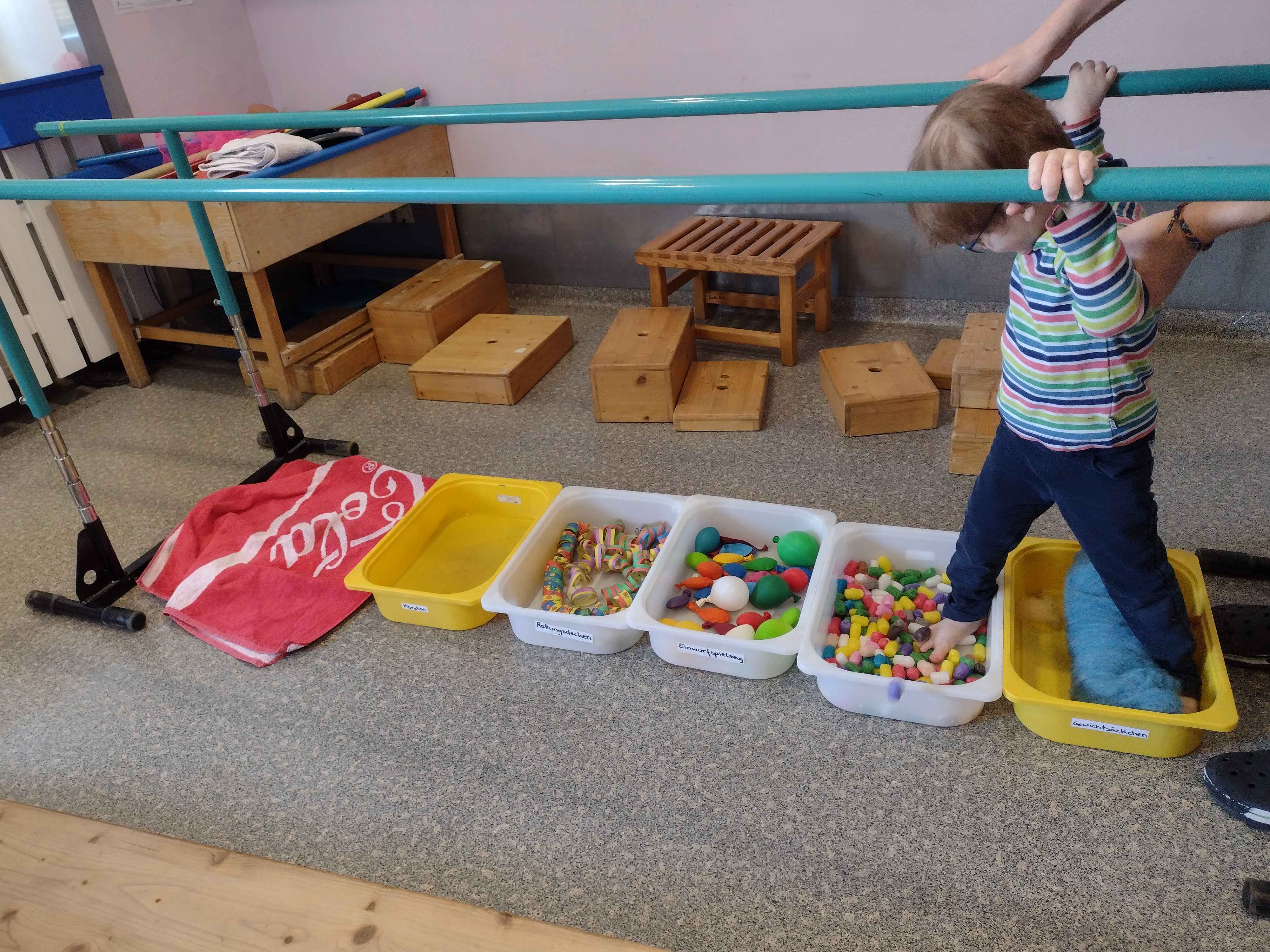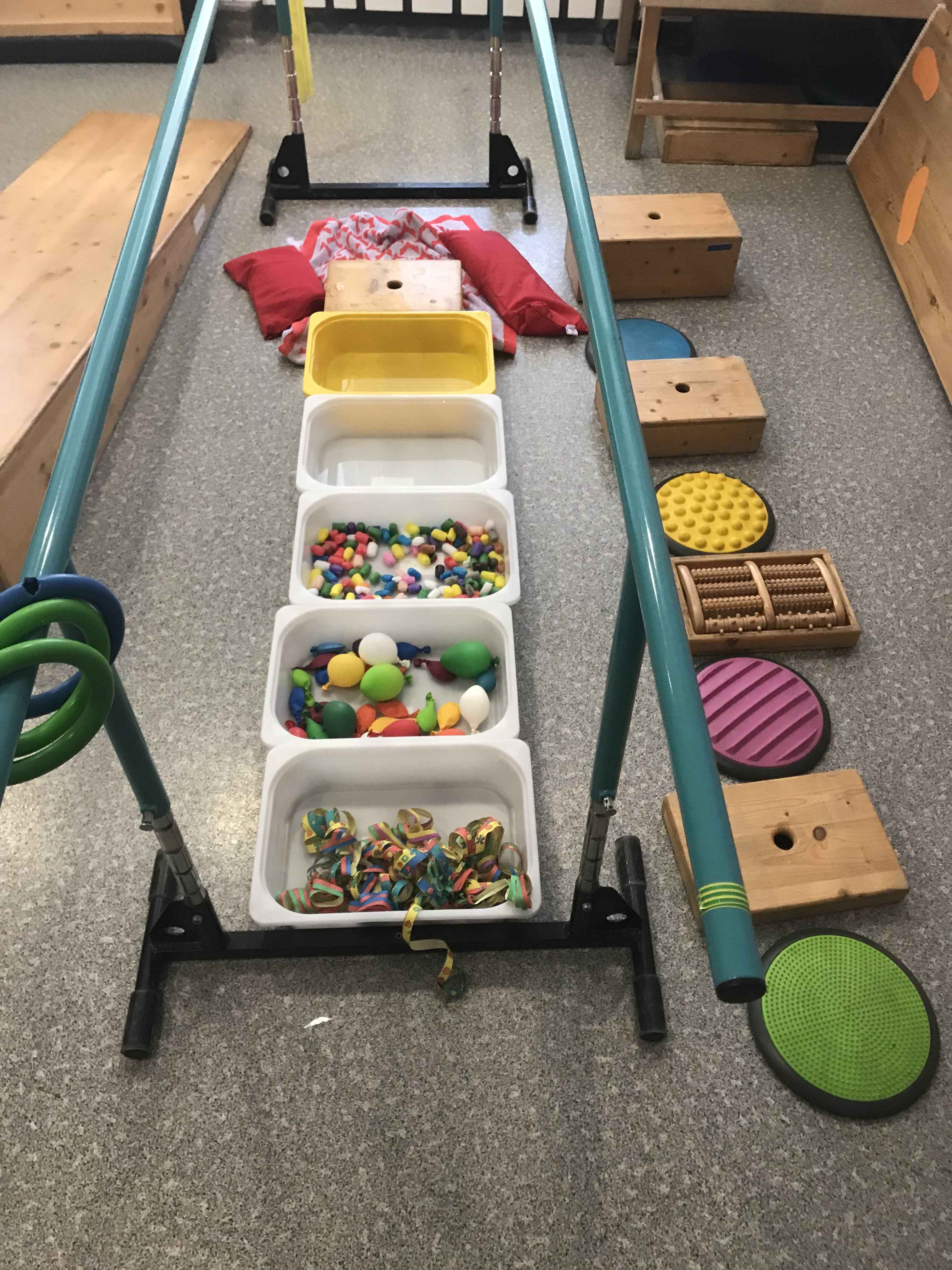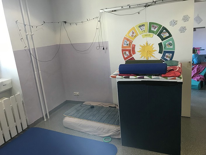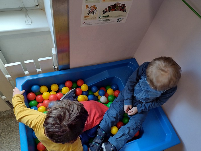 In der dritten Januarwoche richtete ich als zusätzliches Freizeitangebot ein Bällebad für die Kinder ein. Es fördert die Motorik, den Gleichgewichtssinn und die Kreativität der Kinder. Gleichzeitig schult es mehrere Sinne. Dazu gehören zum Beispiel die Körperwahrnehmung, die Tiefensensibilität und das Berührungsempfinden der Kinder. Aufgrund dieser vielseitigen Wirkung wird das Bällebad auch von unserer Physiotherapeutin als eine Methode ihrer Therapie eingesetzt.