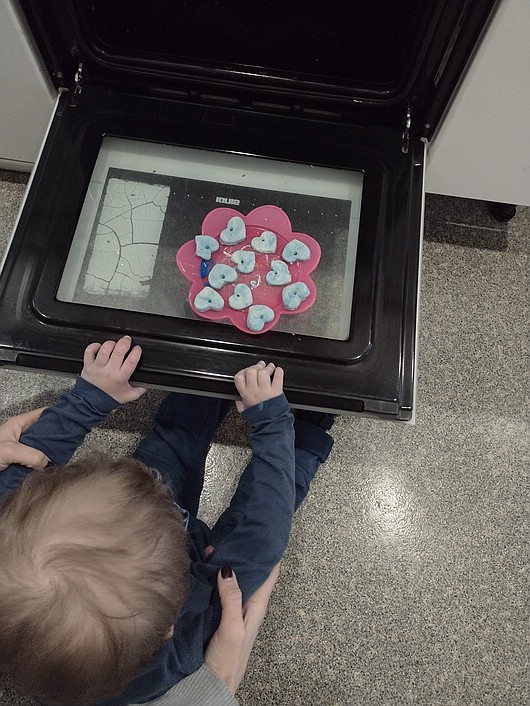 Außerdem gestalteten wir mit den Kindern zum Thema Schnee Herzen aus Salzteig. Ich ließ die Kinder dabei mit den Zutaten experimentieren, sodass alle Sinne angesprochen und gefördert wurden. Nach dem Kneten gaben wir noch blaue Farbe in den Salzteig. Dadurch sah die Masse fast aus wie Schnee und die Kinder konnten den Zusammenhang zu unserem Winterthema herstellen. Am nächsten Tag rollten wir den Teig aus und stachen Herzen aus. Dies schult die Kinder in ihrer Feinmotorik. Zum Schluss wurden die Schneeherzen in die Küche gebracht und im Ofen gebacken, sodass sie trocknen konnten. In verschiedenen Erlebnisgeschichten lernten die Kinder unterschiedliche Tiere kennen, die im Schnee leben. Wir erfuhren dabei, wie die Tiere sich anhören und anfühlen. Einige Bewegungen der Tiere versuchten wir nachzuahmen.
