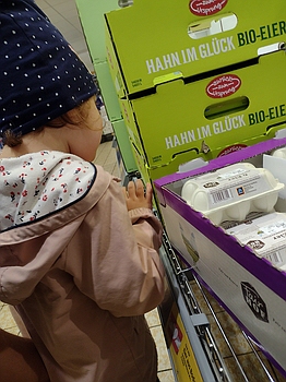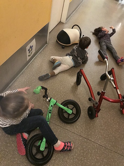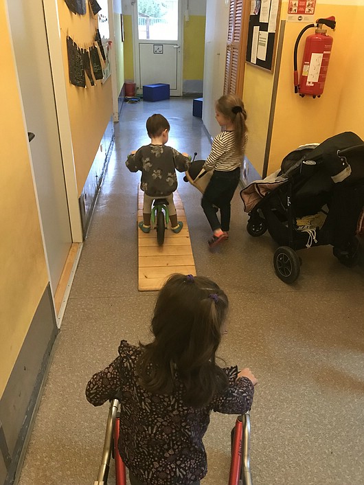 Aufgrund des schlechten Wetters im Januar haben wir viele Aktivitäten auf den Gang verlegt. Dort baute ich einen Parcours für meine Gruppe und die Integrationsgruppe auf. Hier konnten sie sich mit Fahrrädern, Fahrzeugen oder Gehhilfen fortbewegen oder Unfall mit Sanitäter und Rettung spielen.