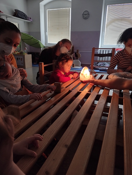 Im Gruppenalltag wurden durch die Physiotherapeutin und der Konduktiv-Fachkraft verschiedene therapeutische Aktivitäten und Konduktiv-Programme durchgeführt. Dabei wird immer auf die Individualität der Kinder geachtet und die Ziele werden im Blick behalten. Die Aktivitäten richteten sich nach unserem derzeitigen Thema Licht und Dunkelheit und griffen die einzelnen Themenbereiche immer wieder auf. Dadurch entsteht eine kognitive Verknüpfung mit dem Thema. Durch die Wiederholung verfestigen sich die Handlungsschritte im Ablauf des Therapiealltags.