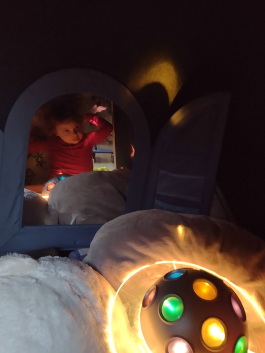 Im Rahmen meiner Facharbeit gestaltete ich eine Ecke in unserem Gruppenraum als Snoezelen-Bereich um. Diese Ecke soll unseren Kindern einen Aufenthalt in gemütlicher, ruhiger und reizarmer Atmosphäre bieten. Die Kinder nehmen mein Angebot bereits gut an und zeigen selbständig Interesse an den unterschiedlichen Wahrnehmungsmaterialien.