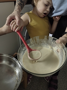 Dabei wurden den Kindern lebenspraktische Kompetenzen vermittelt. Wir lernten die Zutaten kennen und begleiteten dies mit einem Lied. Für die Zubereitung bekam jedes Kind eine passende Aufgabe. Zum Anrühren des Teiges wurden die Zutaten in Montessori-Schüttbechern von den Kindern in die Schüssel gekippt. Die Rührbewegung führte jedes Kind mit individueller Unterstützung aus. Der Teig wurde nun von den Kindern in die Pfanne gegeben und von mir am Herd herausgebacken.