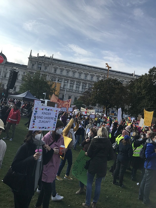 Das Personal meiner Einrichtung traf sich um 9:00 Uhr an der U-Bahn- Station Schottentor. Wir unterhielten uns über die bevorstehende Demonstration und stimmten uns darauf ein. Im Anschluss wurden Schilder und Pfeifen ausgeteilt und wir machten uns auf dem Weg zu der Versammlung. Dort schlossen wir uns weiteren Demonstrant:innen an und tauschten unsere Meinungen aus. Die Versammlung startete um 10:00 Uhr. Es kamen verschiedene Redner aus unterschiedlichen Bereichen auf die Bühne. Laut Veranstalter sollen bei der Demonstration ca. 5.000 Interessierte für bessere Bedingungen im Pädagogischen Arbeitsfeld gekämpft haben.