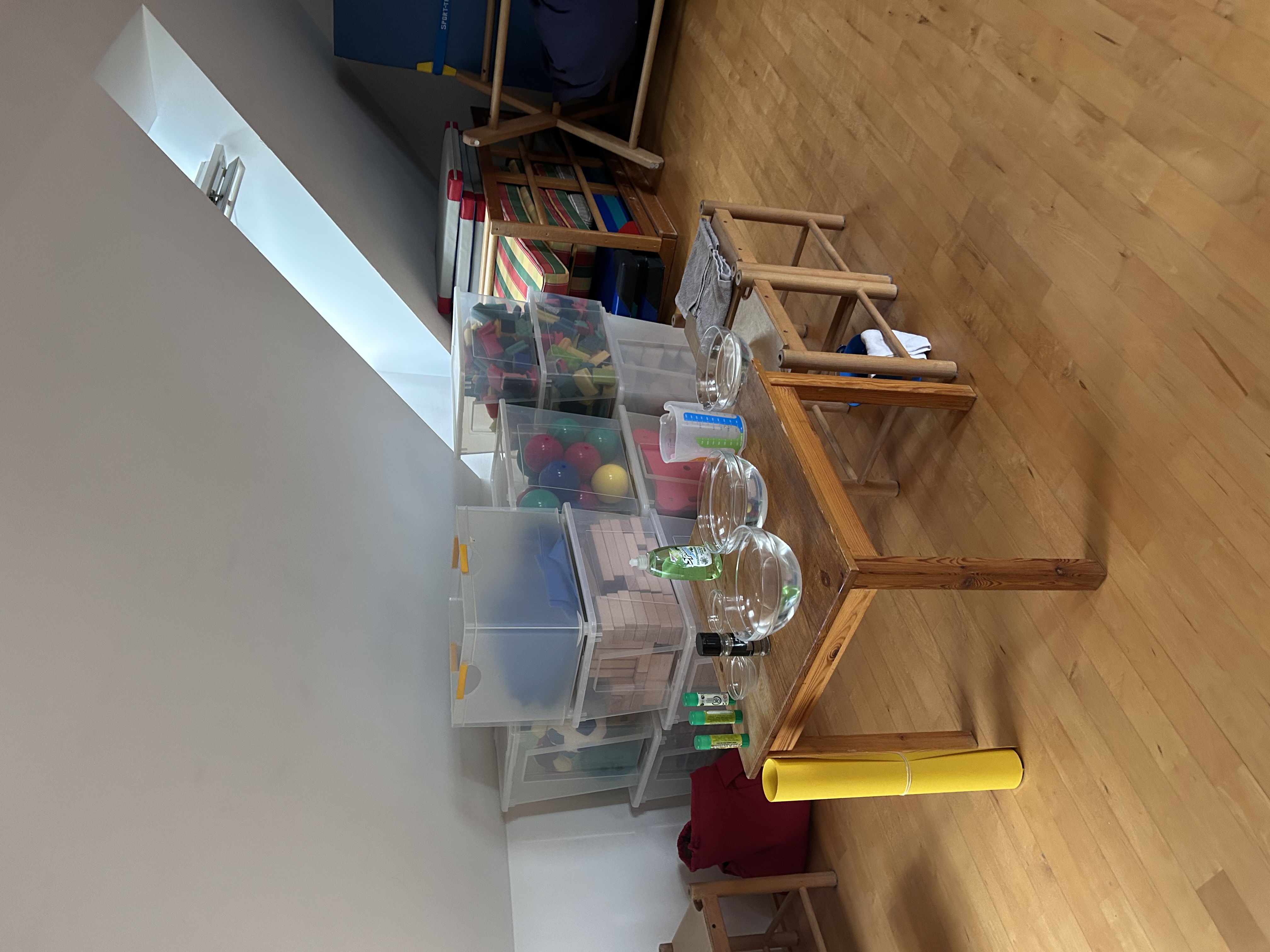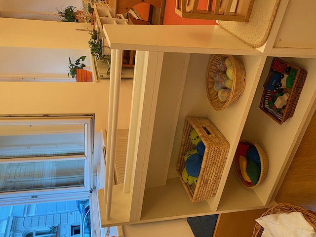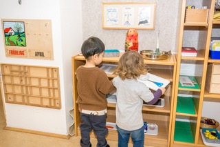Bücher, Montessori-Material im Bereich der Farben- und Formenlehre sowie Hand-Augen-Koordination etc.