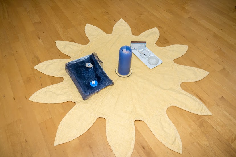 Die Kinder setzten sich in den Kreis, der mit ihren Bildkarten versehen ist. Ich habe den Morgenkreis mit einem Spruch eröffnet. Dieses Ritual schafft einen fließenden Übergang und soll helfen, die Aufmerksamkeit der Kinder zu sammeln. Ich habe ein Kind gewählt, welches die Kerze anzünden durfte. Hier im Montessorihaus lernen bereits die jüngsten Kinder den Umgang mit Streichhölzern. Meine Hilfestellung war aus Sicherheitsgründen trotzdem nicht wegzudenken. Im Anschluss daran starteten wir den Tag mit einem Begrüßungslied. Dieses altbekannte Ritual vermittelt den Kindern Sicherheit und sorgt für einen stimmigen Start.