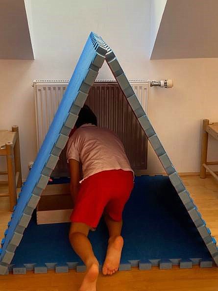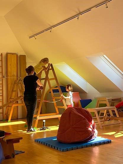 In dieser besonderen Woche sammelt jede Gruppe während ihrer Bewegungsstunde ihre Erfahrungen mit der Cremerutsche. In ihrer Bewegungszeit geht es hinauf ins Dachgeschoss, wo eine große Turnmatte mit einer schwarzen Folie bedeckt als Rutschfläche dient – unsere Cremerutsche.