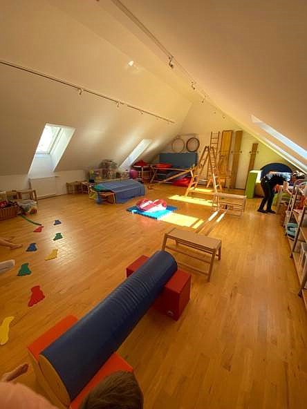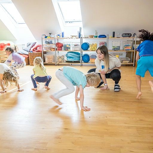 Geturnt wird im Kinderhaus, abgesehen von den Waldtagen, täglich. Die Turnstunden finden so statt, dass jedes Kind einmal pro Woche 45 Minuten Bewegungszeit im Dachgeschoss genießen kann.