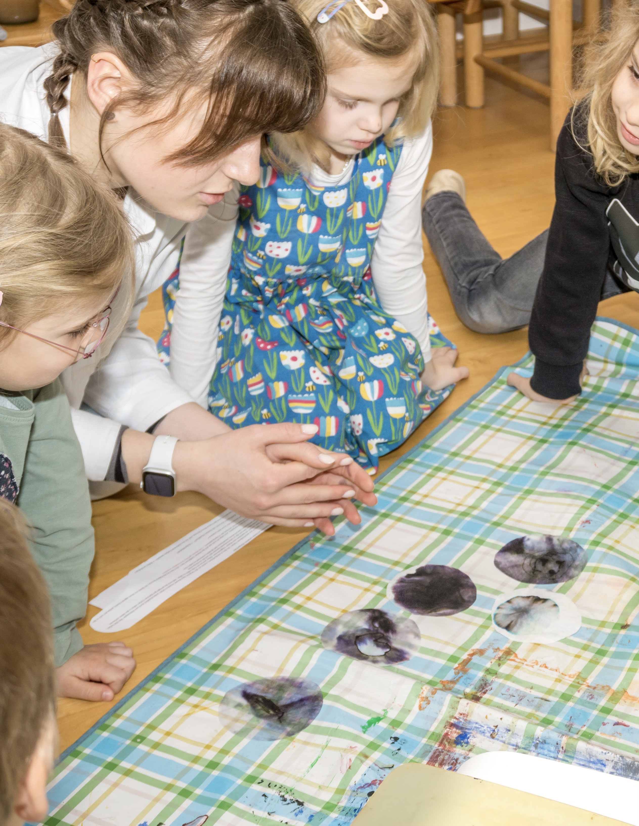 Wir begannen ihn mit einer frühlingshaften Bilderbuchgeschichte, die auf eine große Leinwand projiziert und von einer Pädagogin lebendig erzählt wurde. Die Kinder lauschten gespannt, tauchten in die Geschichte ein und ließen sich von der sanften Stimmung in den Tag tragen.