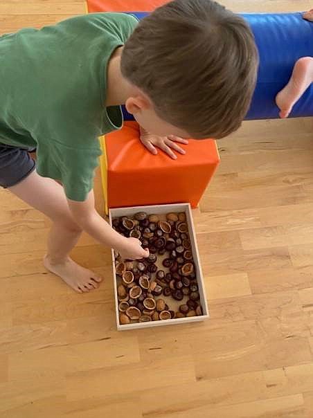 Auf den Bildern wurde eine Bewegungsbaustelle als Rundgang aufgebaut. Dieser wurde mit der Thematik „Eichhörnchen“ verbunden. Das Eichhörnchen und seine Art sich fortzubewegen, sich zu ernähren und zu schlafen, wurde am Anfang der Bewegungsstunde besprochen. Während des Rundgangs haben die Kinder zu Beginn die Aufgabe bekommen, sich eine Kastanie zu nehmen und diese einmal im Kreis herum über den Weg zu transportieren, um sie im Zuhause des Eichhörnchens, dem sogenannten „Kobel“, abzulegen.