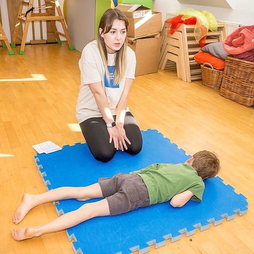 Die Kinder ziehen sich ihre Badehose an, um die Berührungsreize möglichst intensiv wahrzunehmen. In Vierergruppen betreten sie die Matte, während die Pädagogin Nivea Body Lotion mit etwas Wasser darauf verteilt, sodass die Fläche rutschig wird. Die Kinder cremen sich zudem mit Nivea Creme ein und massieren sie in die Haut ein. Wer möchte, kann auch eine sanfte Massage von der Pädagogin erhalten – natürlich freiwillig, kein Kind wird dazu gedrängt.