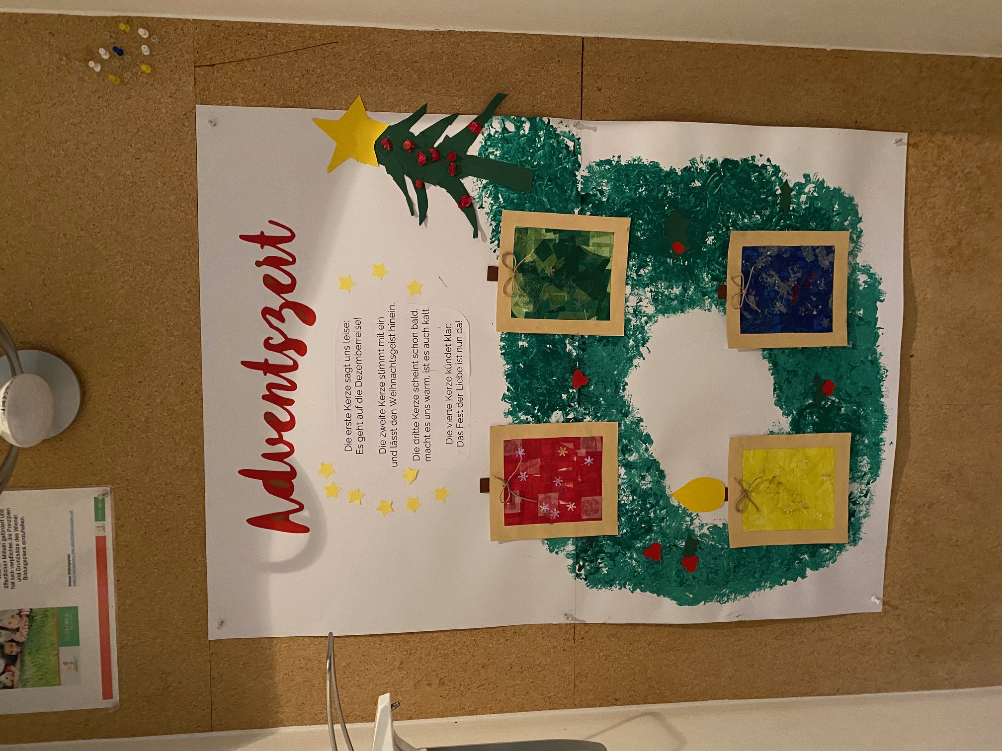 In jedem neuen Monat wird ein Plakat für den Eingangsbereich von einer Pädagogin oder einem Pädagogen gestaltet. Dieses Plakat ist vor der Eingangstür des Kinderhauses sichtbar und soll über aktuelle Geschehnisse in der Einrichtung berichten, gedanklich auf Feste und besondere Anlässe einstimmen oder zeigen, mit welchen kreativen Aktivitäten sich die Kinder zurzeit beschäftigen. Natürlich bietet es sich sehr an, die Kinder während des Gestaltungsprozesses miteinzubeziehen. Diesen Monat war ich an der Reihe und aufgrund des zeitlichen Anlasses, wollte ich, gemeinsam mit den Kindern, den Advent einzuläuten.